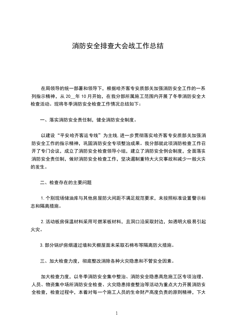 在局领导的统一部署和领导下,根据哈齐客专安质部关加强消防安全工作的一系列指示精神,从20__年10月开始,在我分部所属施工范围内开展了冬季消防安全大检查活动。现将冬季消防安全检查工作情况总结如下: