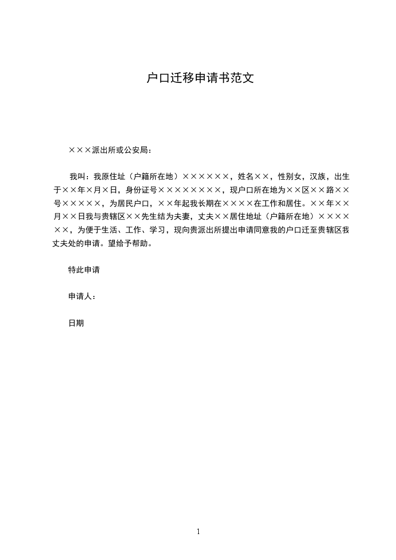 我叫:我原住址(户籍所在地)××××××,姓名××,性别女,汉族,出生于××年×月×日,身份证号××××××××,现户口所在地为××区××路××号×××××,为居民户口,××年起我长期在××××在工作和居住。××年××月××日我与贵辖区××先生结为夫妻,丈夫××居住地址(户籍所在地)××××××,为便于生活、工作、学习,现向贵派出所提出申请同意我的户口迁至贵辖区我丈夫处的申请。望给予帮助。