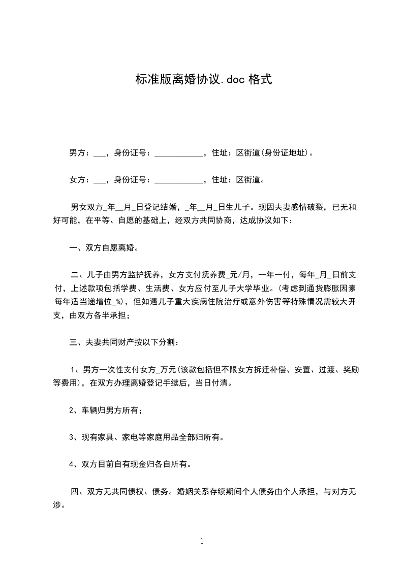 三、双方有位于房产一套,归_______男方/女方所有,由_______女方/男方一次性给付_______男方/女方现金 ____________ 万元;车辆、存款等分割方案:_________________。