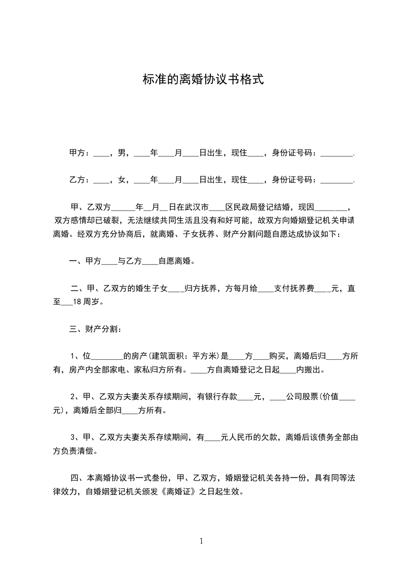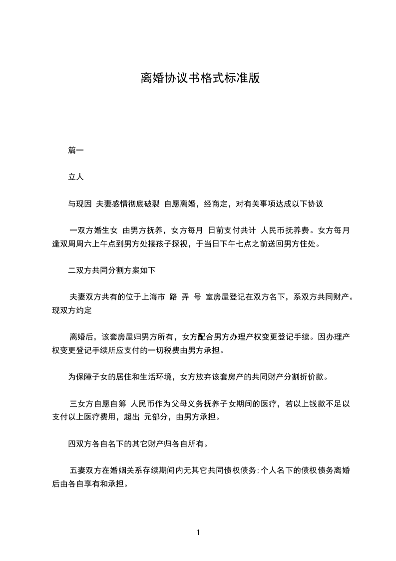 五、本协议一式三份,双方各执一份,婚姻登记机关存档一份,双方签字,并经婚姻登记机关办理离婚手续后生效。