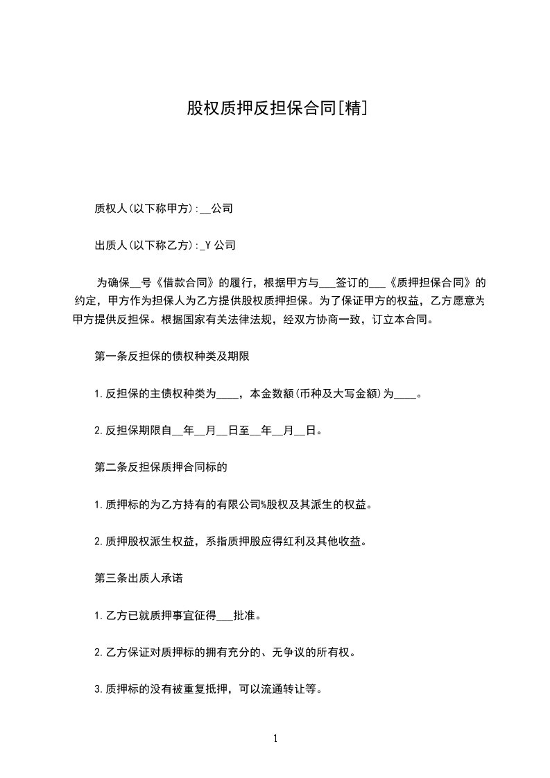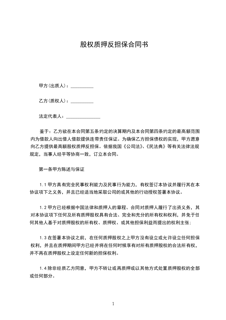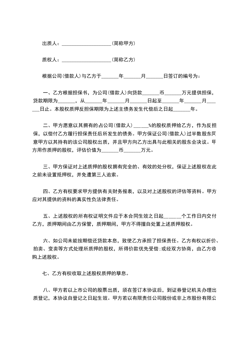 二、甲方愿意以其拥有的占公司(借款人)________%的股权质押给乙方,作为反担保,以偿付乙方履行担保责任后所发生的债务。甲方保证公司(借款人)过半数股东同意甲方以其持有的该公司股权出质,并且甲方向乙方出具与此相关的股东会决议。甲方用作质押的股权,评估价值为币________万元。