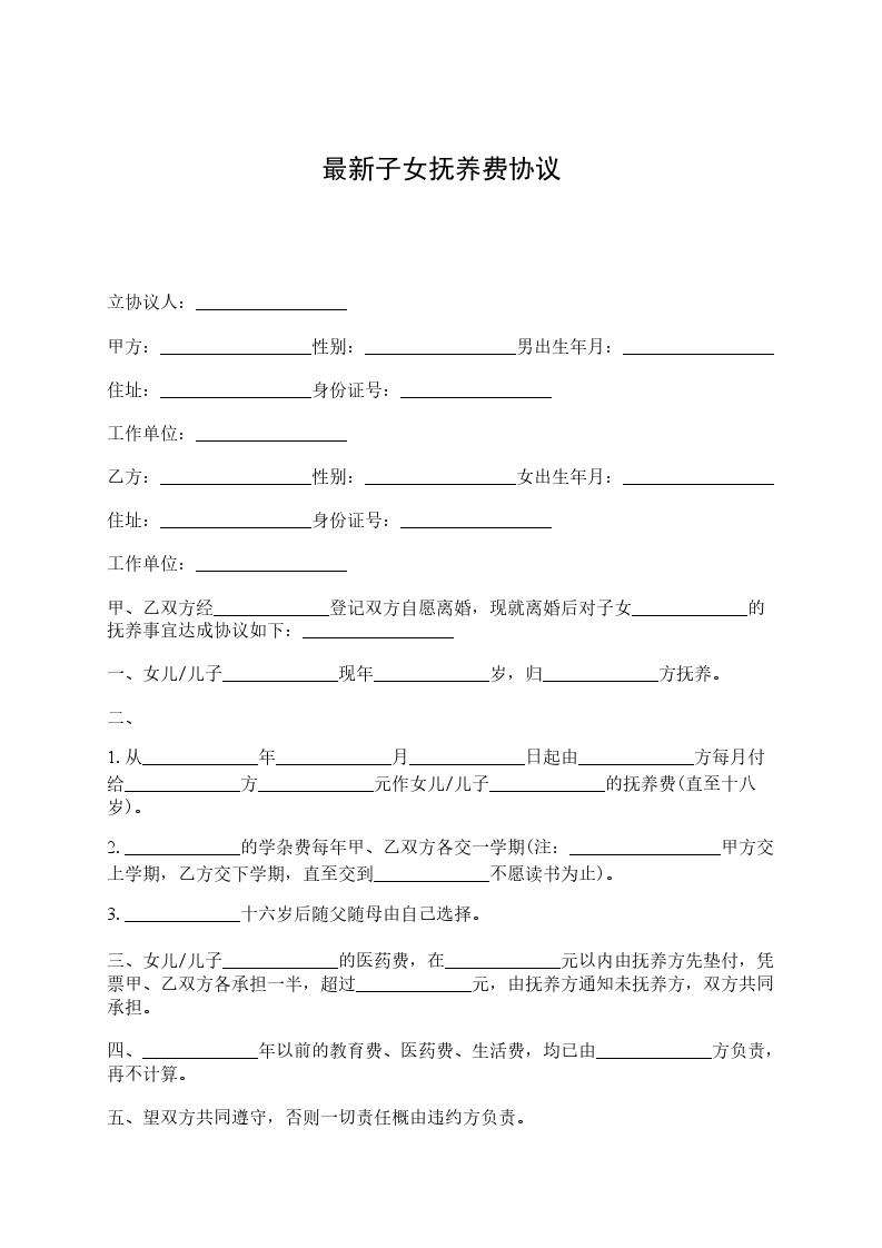 二、乙方于本协议生效之日一次性支付甲方抚养费、教育费、医疗费等总计人民币__________万元(__________万元)。