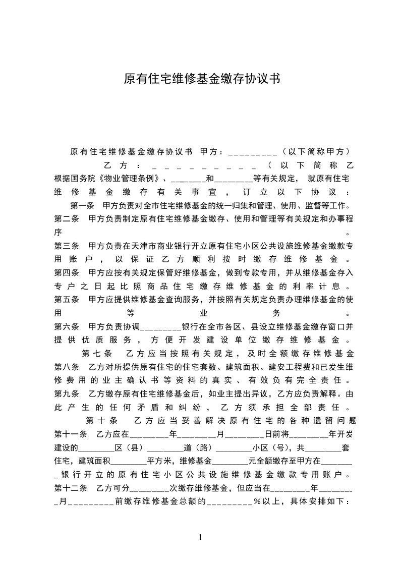 原有住宅维修基金缴存协议书 甲方:_________(以下简称甲方)