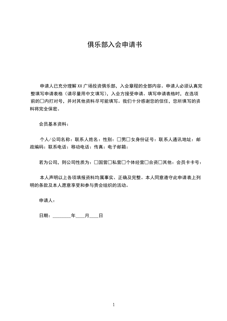 申请人已充分理解XX广场投资俱乐部,入会章程的全部内容。申请人必须认真完整填写申请表格(请尽量用中文填写),入会方接受申请。填写申请表格时,在选项前的□内打对号,并对其他资料尽可能填写。我们十分感谢您的信任,您所填写的资料将完全保密。
