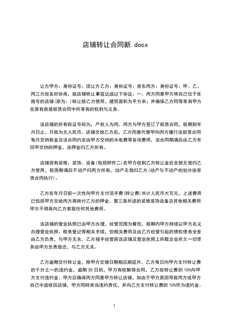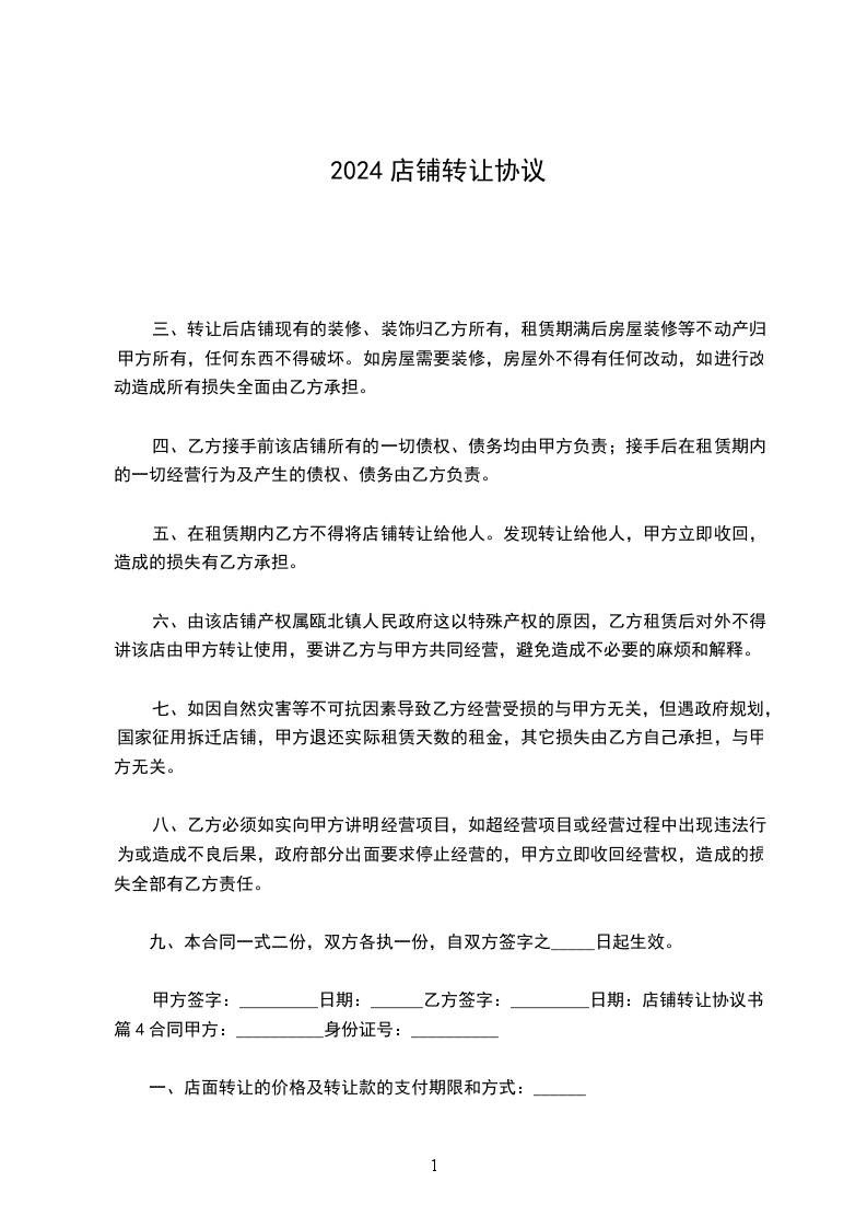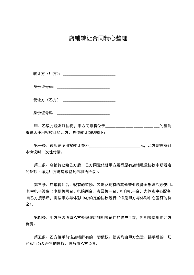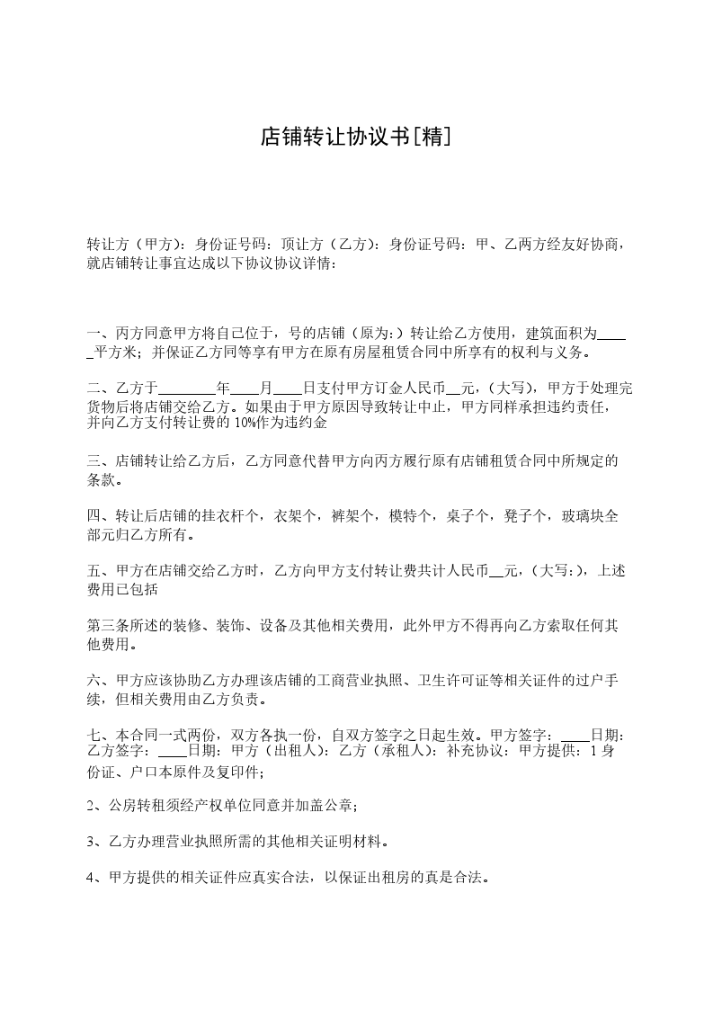 甲、乙双方经友好协商,就店铺转让事宜达成以下协议: