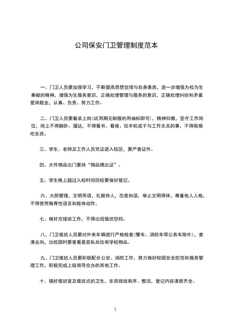 九、门卫值班人员要积极配合公安、消防工作,努力做好校园安全防范和服务管理工作,积极完成上级领导交办的其他工作。