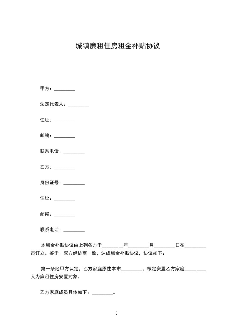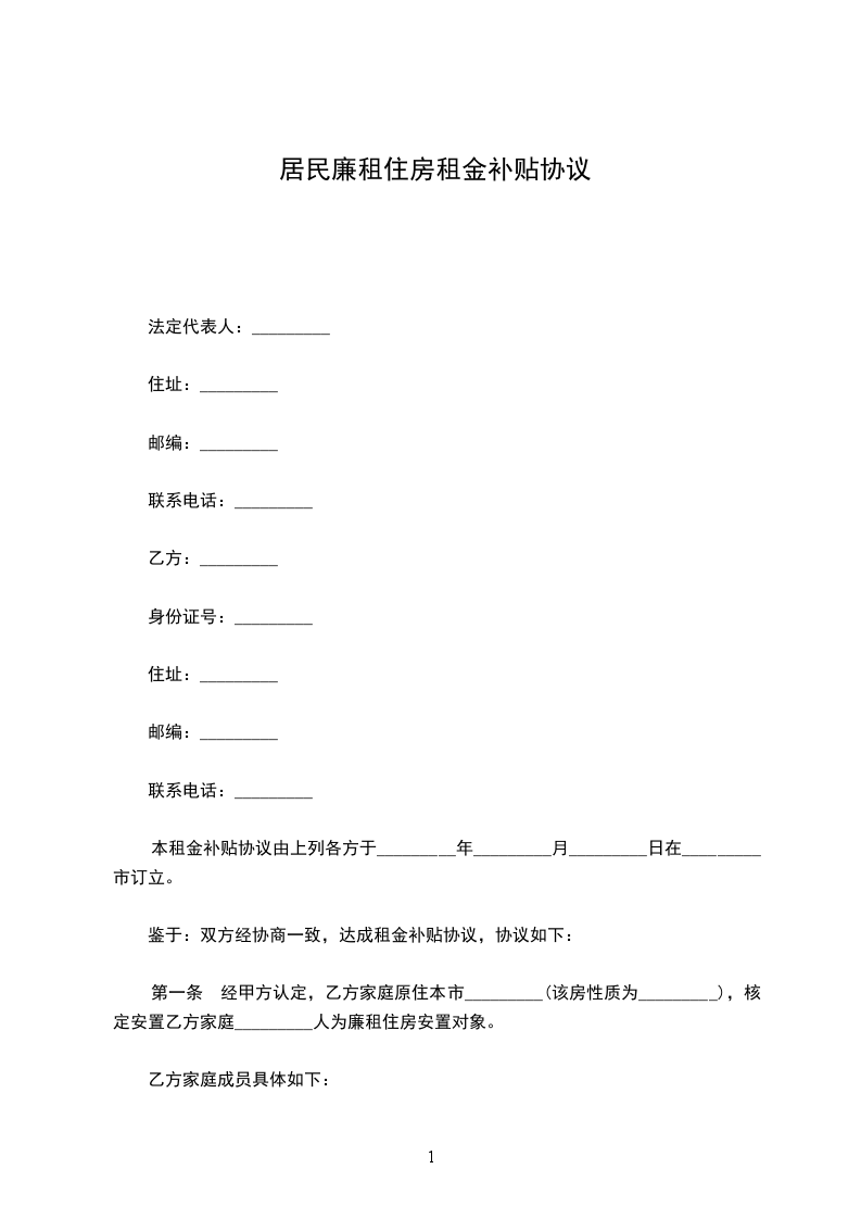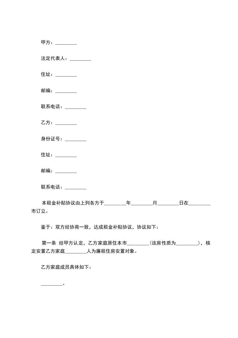 第二条经乙方自愿选择,甲方采取租金补贴形式,安置解决乙方家庭全体廉租对象住房困难。