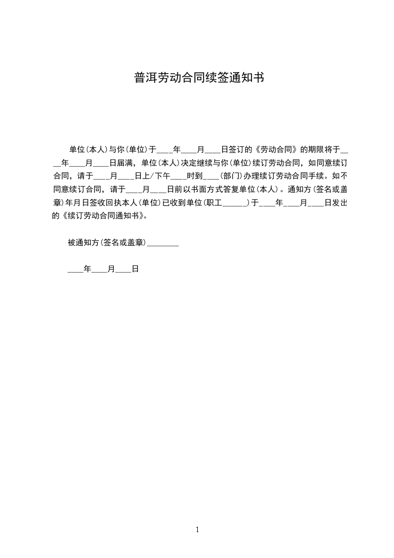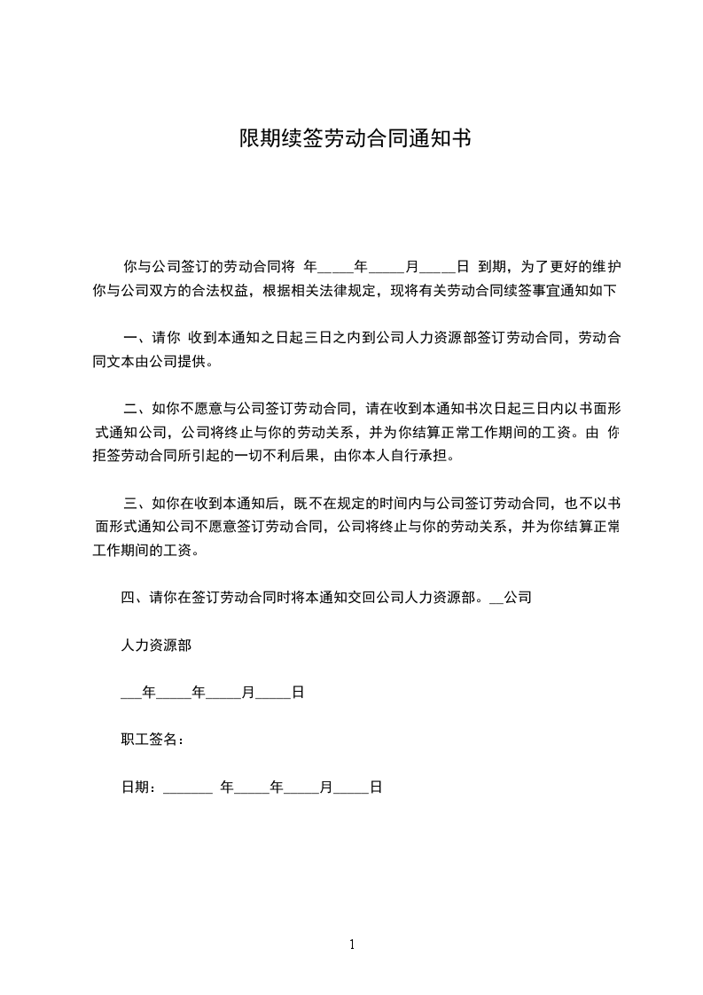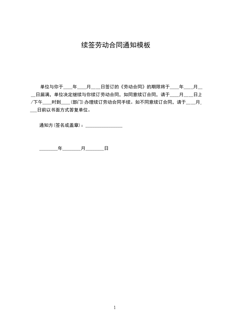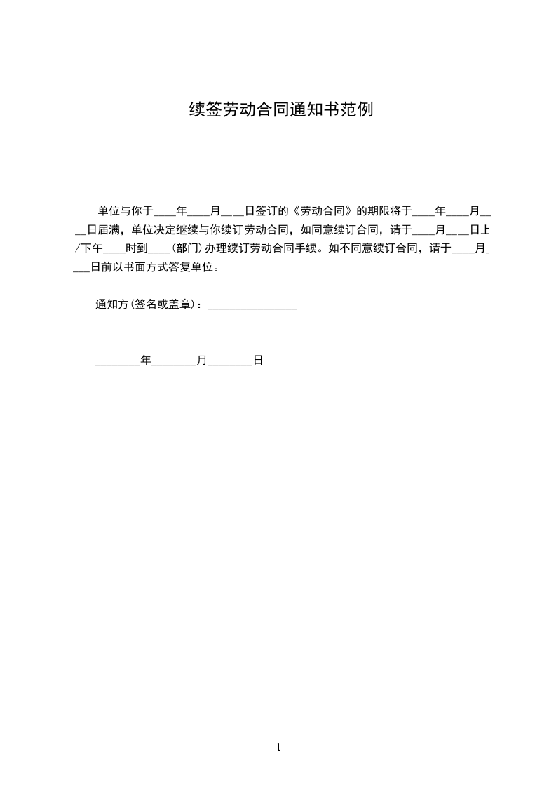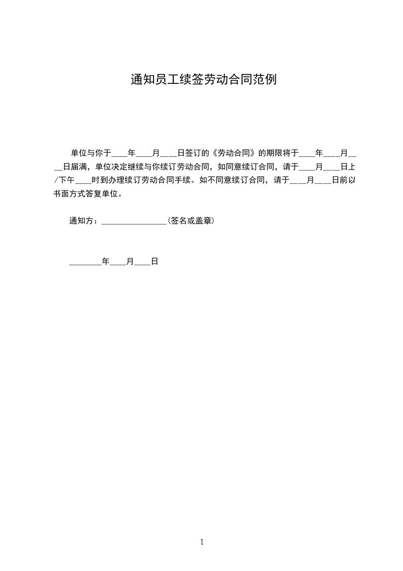单位与你于____年____月____日签订的《劳动合同》的期限将于____年____月____日届满,单位决定继续与你续订劳动合同,如同意续订合同,请于____月____日上/下午____时到____(部门)办理续订劳动合同手续。如不同意续订合同,请于____月____日前以书面方式答复单位。