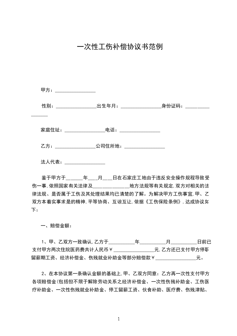 鉴于甲方于_______年____月____日在石家庄工地由于违反安全操作规程导致受伤一事,依照国家有关法律及_______________地方法规等有关规定,双方对相关的法律法规、是否属于工伤及其处理结果均已清楚的了解。为解决甲方工伤事宜,甲、乙双方本着实事求是的精神,平等协商、互谅互让,依据《工伤保险条例》,达成协议如下: