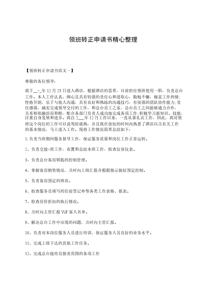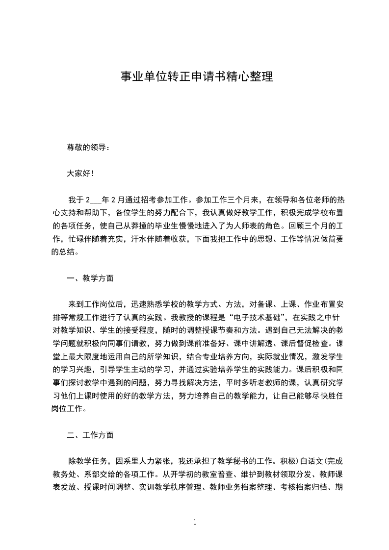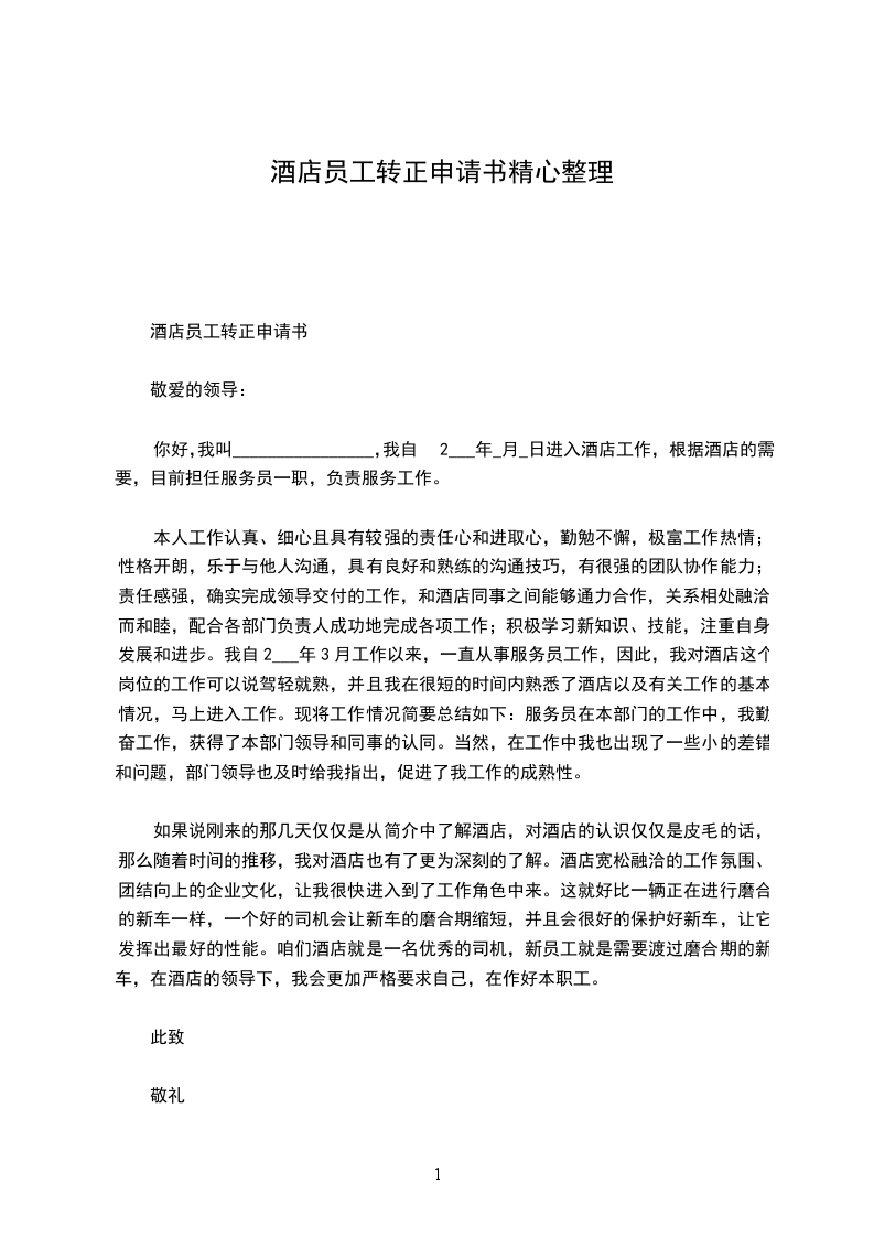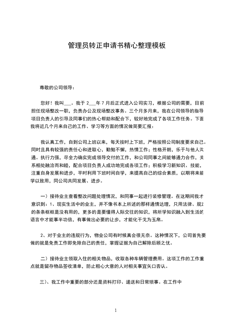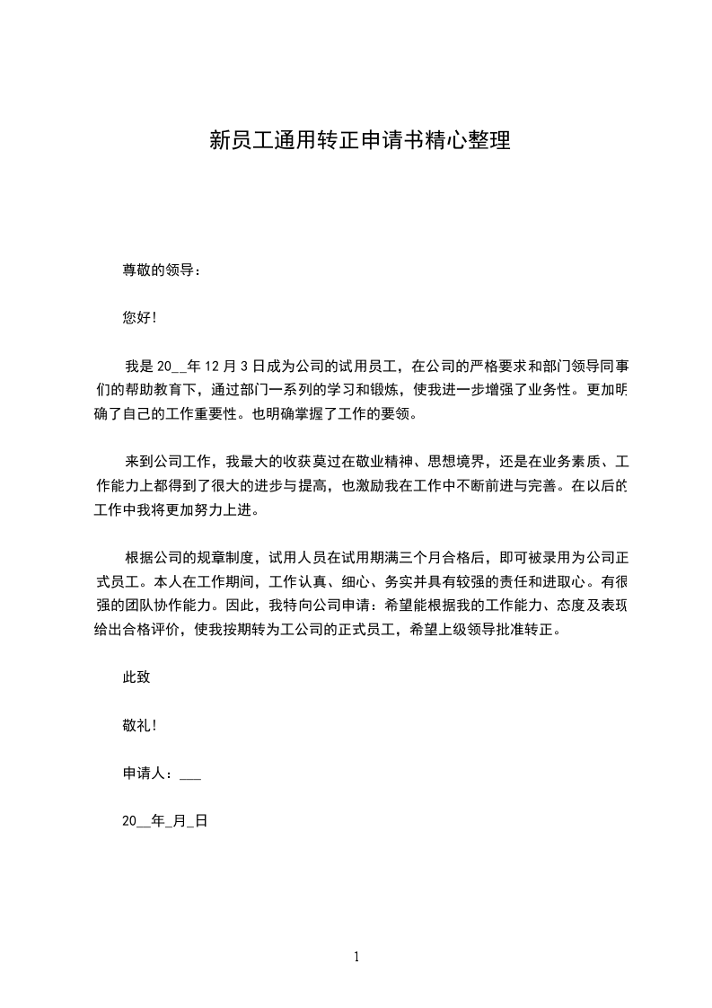 我20__年_月_日成为公司的试用员工,到今天_个月试用期已满,根据公司的规章制度,现申请转为公司正式员工。从来公司的第一天开始,我就把自己融入到我们的这个团队中,现将这_个月的工作情况总结如下: