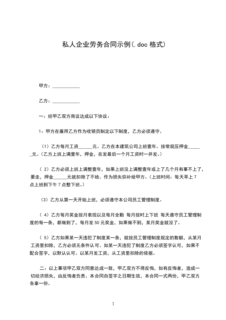 (1)乙方每月工资______元。乙方在本建筑公司上班壹年。按常规压押金______元。(乙方上班上满壹年,押金,在发最后一个月工资时一并发。)