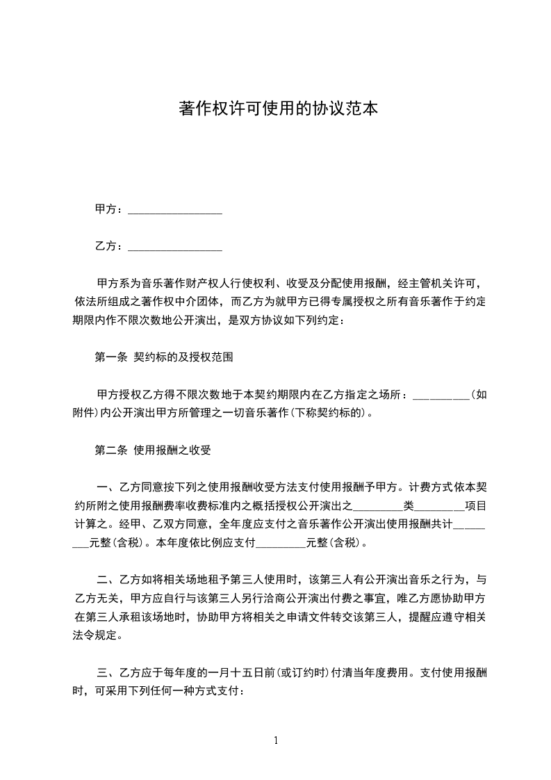 一、乙方同意按下列之使用报酬收受方法支付使用报酬予甲方。计费方式依本契约所附之使用报酬费率收费标准内之概括授权公开演出之_________类_________项目计算之。经甲、乙双方同意,全年度应支付之音乐著作公开演出使用报酬共计_________元整(含税)。本年度依比例应支付_________元整(含税)。