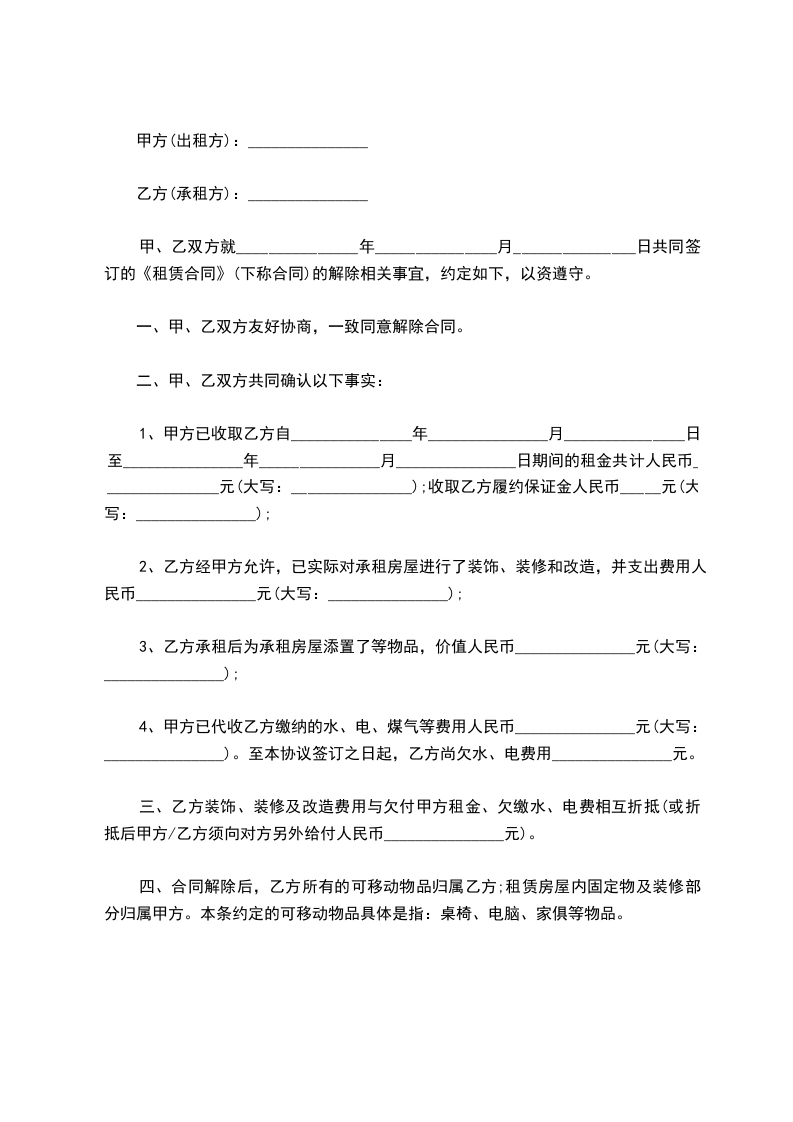甲、乙双方就_______________年_______________月_______________日共同签订的《租赁合同》(下称合同)的解除相关事宜,约定如下,以资遵守。