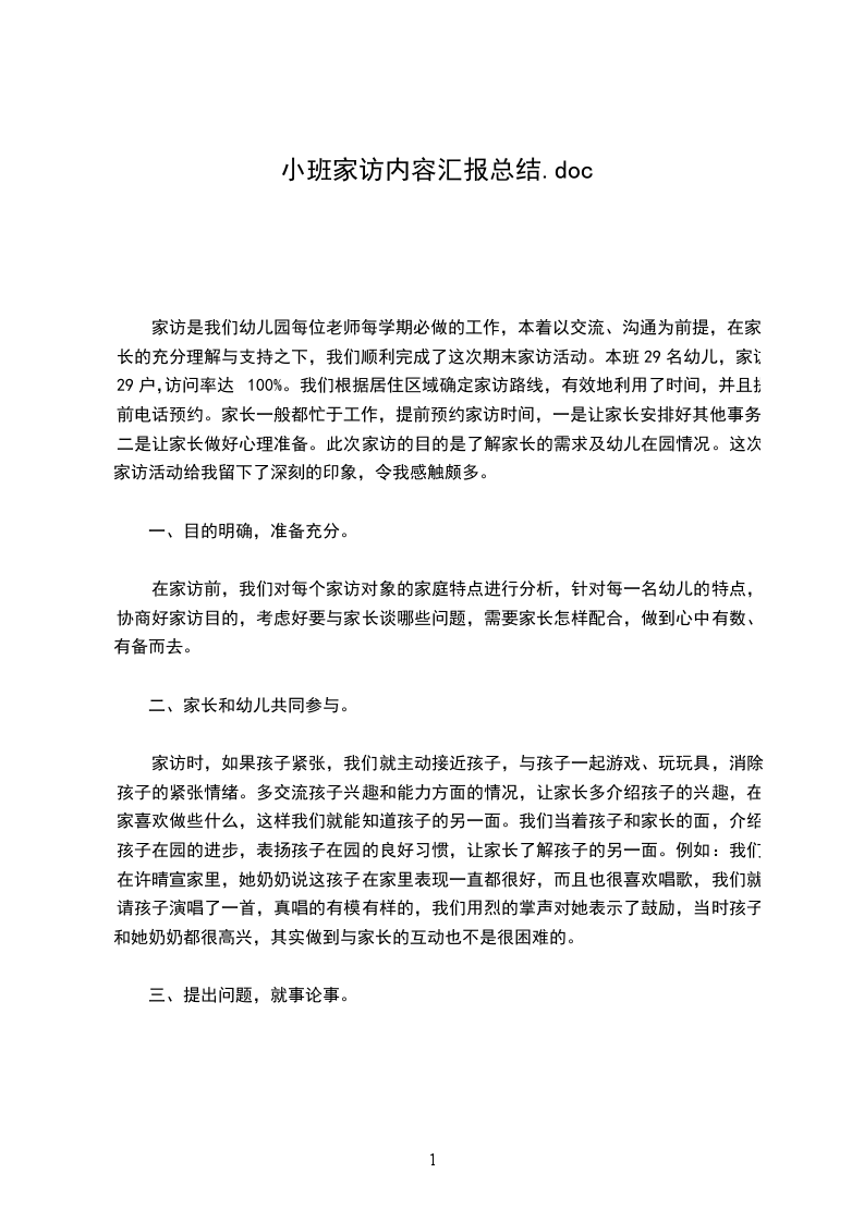 家访是我们幼儿园每位老师每学期必做的工作,本着以交流、沟通为前提,在家长的充分理解与支持之下,我们顺利完成了这次期末家访活动。本班29名幼儿,家访29户,访问率达100%。我们根据居住区域确定家访路线,有效地利用了时间,并且提前电话预约。家长一般都忙于工作,提前预约家访时间,一是让家长安排好其他事务,二是让家长做好心理准备。此次家访的目的是了解家长的需求及幼儿在园情况。这次家访活动给我留下了深刻的印象,令我感触颇多。
