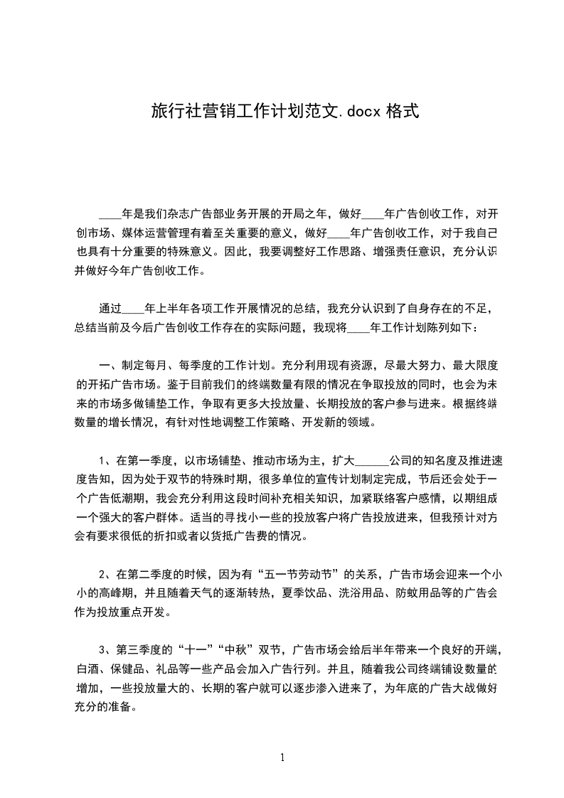 一、制定每月、每季度的工作计划。充分利用现有资源,尽最大努力、最大限度的开拓广告市场。鉴于目前我们的终端数量有限的情况在争取投放的同时,也会为未来的市场多做铺垫工作,争取有更多大投放量、长期投放的客户参与进来。根据终端数量的增长情况,有针对性地调整工作策略、开发新的领域。