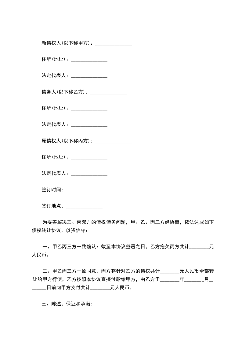 一、三方同意将乙、丙双方于________年_______月_______日订立的编号为_____________________的借款合同(以下称借款合同)确定的丙方对乙方的债务转移给甲方承担。
