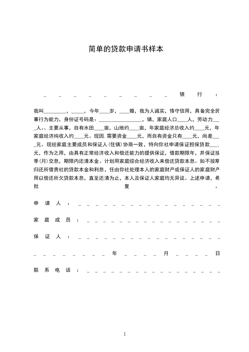 我叫_________,_____,今年____岁,____婚,我为人诚实,恪守信用,具备完全民事行为能力,身份证号码是:_________________,镇,家庭人口____人,劳动力____人。、主要从事,自有水田____亩,山地约____亩,年家庭经济总收入约____元,年家庭经济纯收入约____元。现因.需要资金____元,而自有资金只有____元,尚差____元。现经家庭主要成员和保证人(住镇)协商一致,特向你社申请保证担保贷款____元,作为之用,由具有正常经济收入和偿还能力的提供保证,借款期限年,并保证按季(月)交息,期限内还清本金。计划用家庭综合经济收入来偿还贷款本息。如不按期归还所借贵社的贷款本金和利息,任由你社处理本人的家庭财产或保证人的家庭财产用以偿还所欠贷款本息,直至还清为止,本人及保证人家庭均无异议。上述申请,希批复。