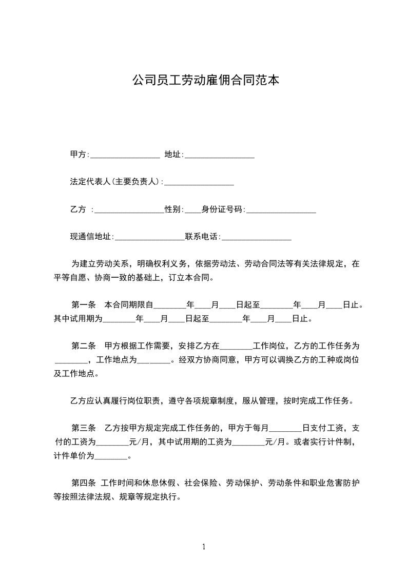 公司员工劳动雇佣合同范本