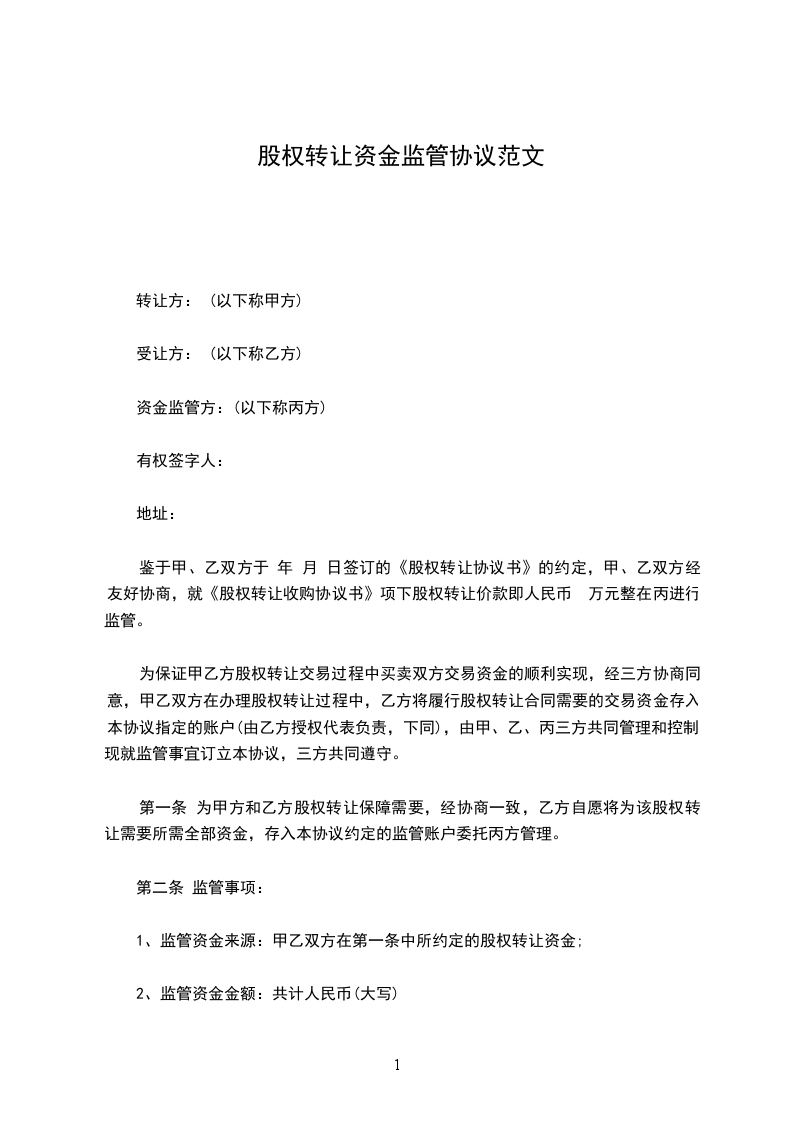 鉴于甲、乙双方于 年 月 日签订的《股权转让协议书》的约定,甲、乙双方经友好协商,就《股权转让收购协议书》项下股权转让价款即人民币 万元整在丙进行监管。