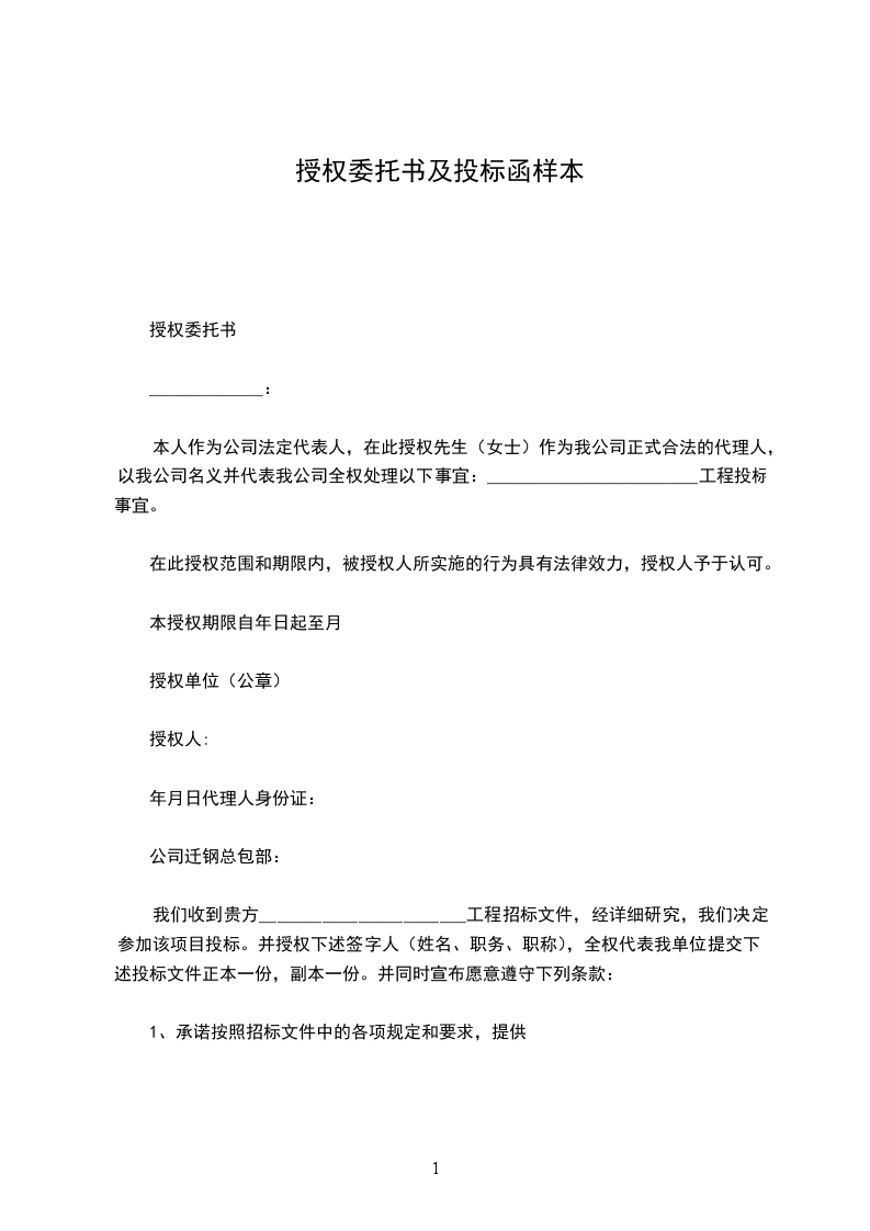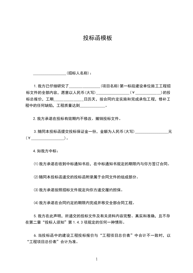 1.我方已仔细研究了________________(项目名称)第一标段建设单位施工工程招标文件的全部内容,愿意以人民币(大写)_________________(¥_____________)的投标总报价,工期_______________日历天,按合同约定实施和完成承包工程,修补工程中的任何缺陷,工程质量达到_____________。
