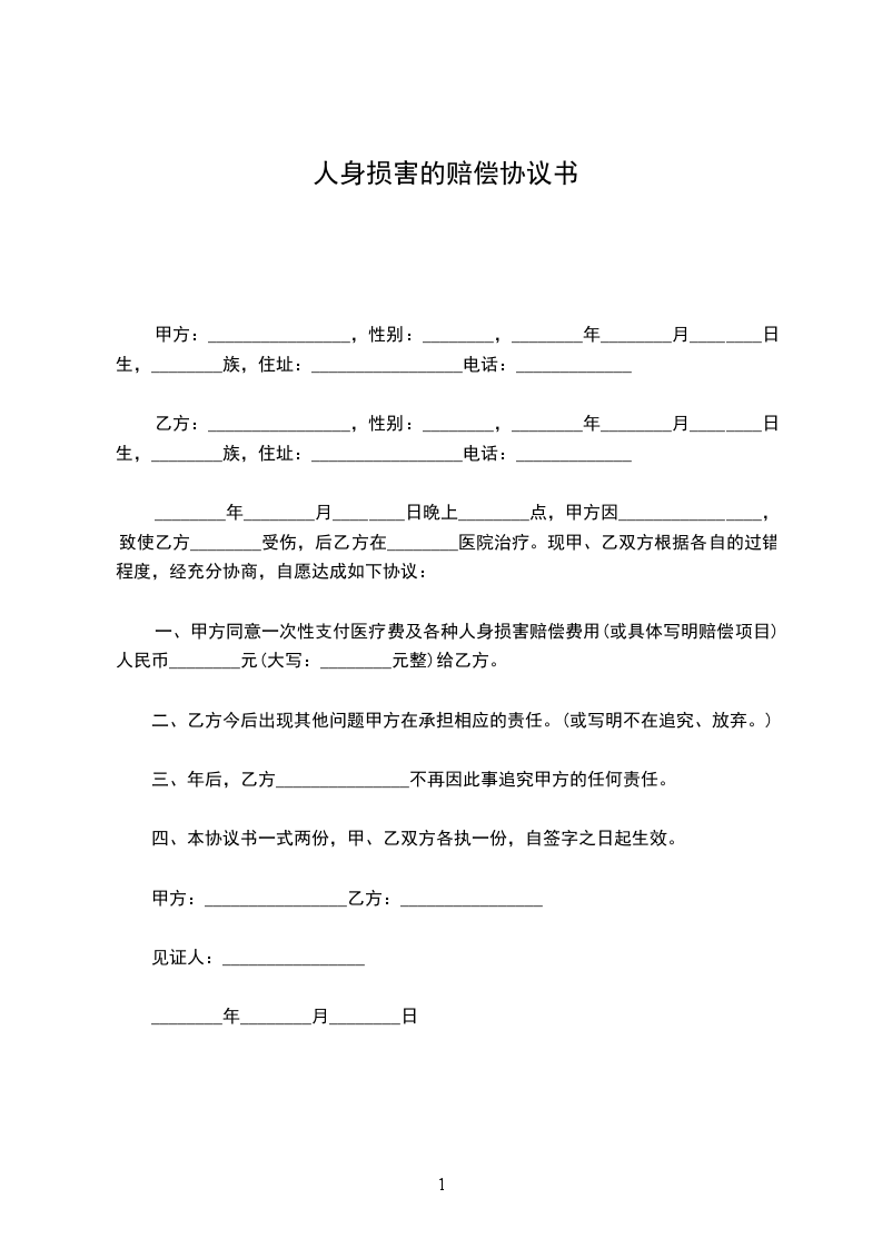 一、甲方同意一次性支付医疗费及各种人身损害赔偿费用(或具体写明赔偿项目)人民币________元(大写:________元整)给乙方。