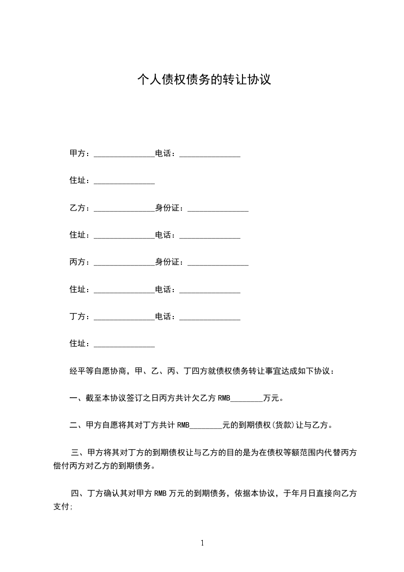 经平等自愿协商,甲、乙、丙、丁四方就债权债务转让事宜达成如下协议: