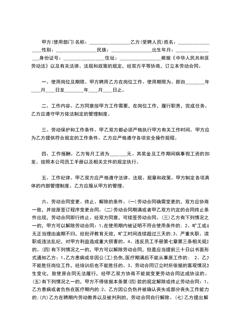 乙方(受聘人员)姓名:_________________性别:_________________民族:_________________