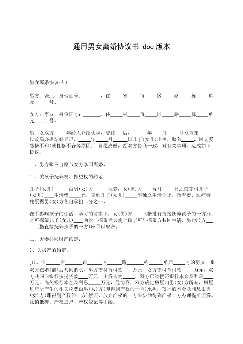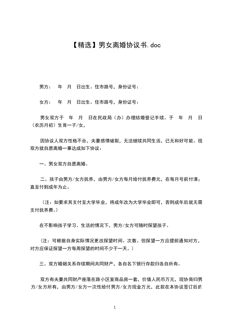 【精选】男女离婚协议书.doc