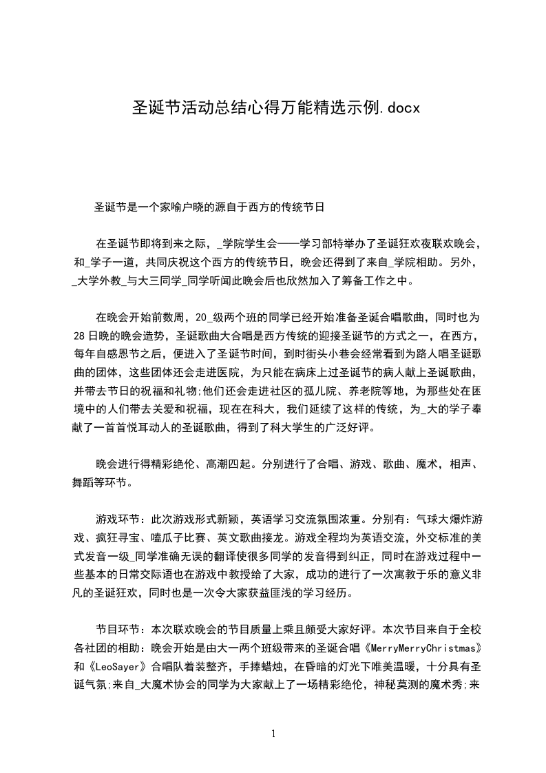 节目环节:本次联欢晚会的节目质量上乘且颇受大家好评。本次节目来自于全校各社团的相助:晚会开始是由大一两个班级带来的圣诞合唱《MerryMerryChristmas》和《LeoSayer》合唱队着装整齐,手捧蜡烛,在昏暗的灯光下唯美温暖,十分具有圣诞气氛;来自_大魔术协会的同学为大家献上了一场精彩绝伦,神秘莫测的魔术秀;来自_学院的_同学为大家献上了一首极具内蒙古民族特色的草原歌曲《英雄上马的地方》由于现场蒙生较多,这首歌使得现场观众与歌者产生共鸣,掌声迭起。来自机械学院的_同学为大家献上了一场节奏欢快、律动感十足地爵士舞《Fire》,嗨翻全场。__学院20_级同学__与__同学的相声节目不断戳中观众笑点,笑声掌声此起彼伏;__学院20_级二班__等人带来的爵士舞《TIKTOK》是现场最火爆的节目之一……正是由于这些精彩的节目,本次联欢晚会才能如此气氛高昂。