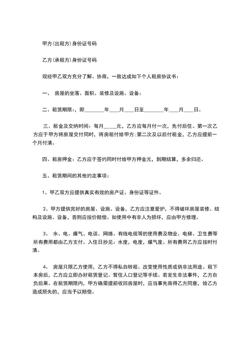 现经甲乙双方充分了解、协商,一致达成如下个人租房协议书: