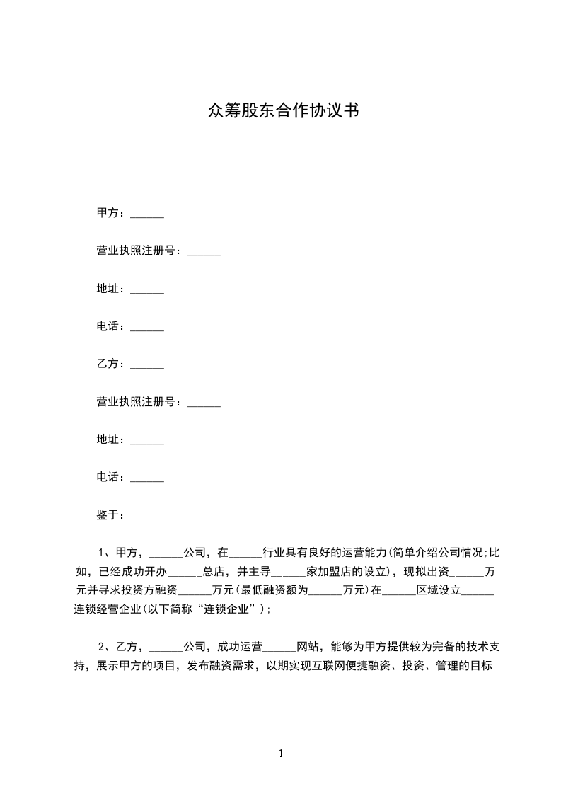 1、甲方,______公司,在______行业具有良好的运营能力(简单介绍公司情况;比如,已经成功开办______总店,并主导______家加盟店的设立),现拟出资______万元并寻求投资方融资______万元(最低融资额为______万元)在______区域设立______连锁经营企业(以下简称“连锁企业”);