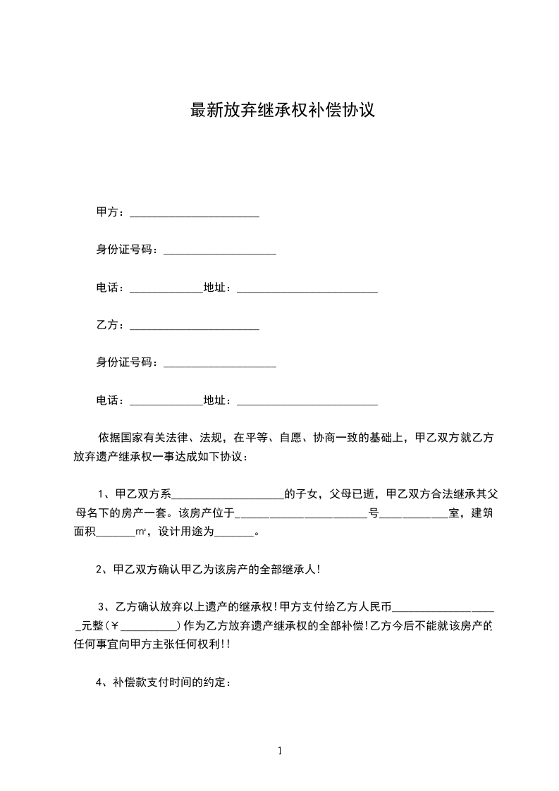 3、乙方确认放弃以上遗产的继承权!甲方支付给乙方人民币___________________元整(¥__________)作为乙方放弃遗产继承权的全部补偿!乙方今后不能就该房产的任何事宜向甲方主张任何权利!!