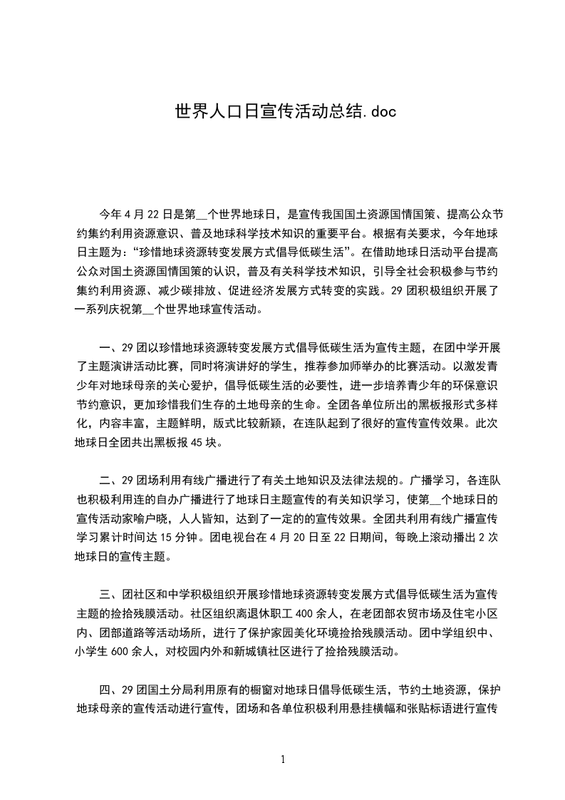 今年4月22日是第__个世界地球日,是宣传我国国土资源国情国策、提高公众节约集约利用资源意识、普及地球科学技术知识的重要平台。根据有关要求,今年地球日主题为:“珍惜地球资源转变发展方式倡导低碳生活”。在借助地球日活动平台提高公众对国土资源国情国策的认识,普及有关科学技术知识,引导全社会积极参与节约集约利用资源、减少碳排放、促进经济发展方式转变的实践。29团积极组织开展了一系列庆祝第__个世界地球宣传活动。