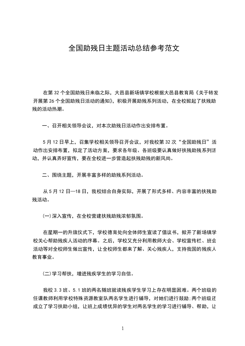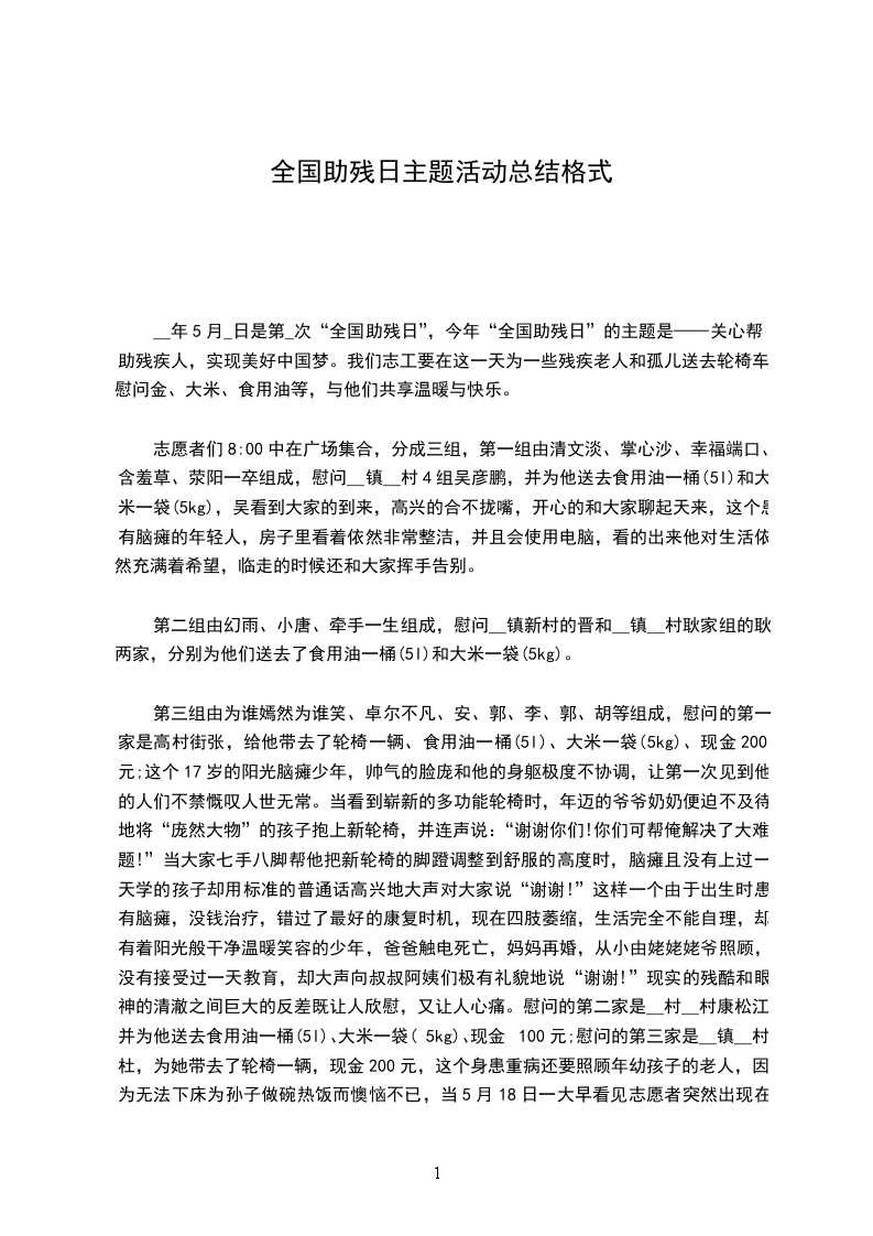 __年5月_日是第_次“全国助残日”,今年“全国助残日”的主题是——关心帮助残疾人,实现美好中国梦。我们志工要在这一天为一些残疾老人和孤儿送去轮椅车、慰问金、大米、食用油等,与他们共享温暖与快乐。