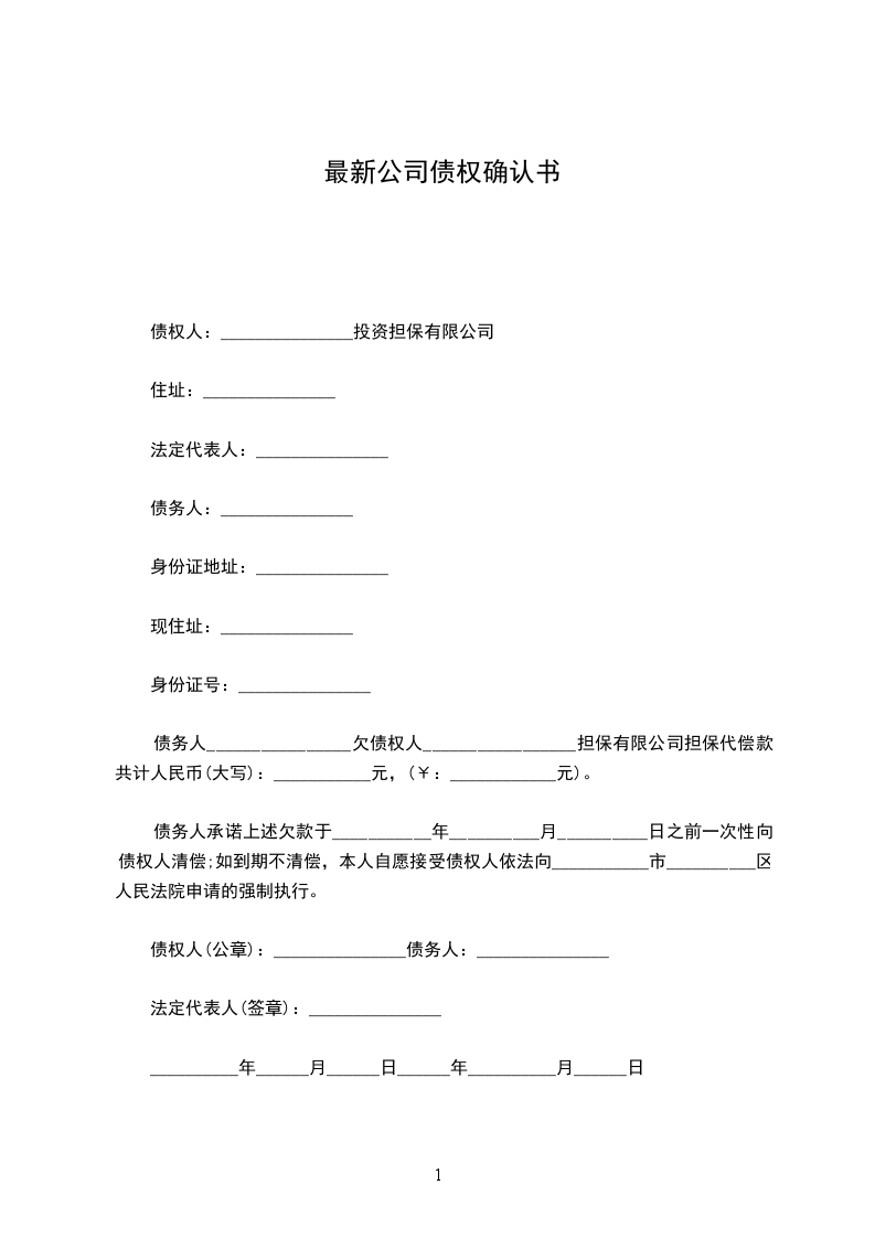 债务人承诺上述欠款于___________年__________月__________日之前一次性向债权人清偿;如到期不清偿,本人自愿接受债权人依法向___________市__________区人民法院申请的强制执行。