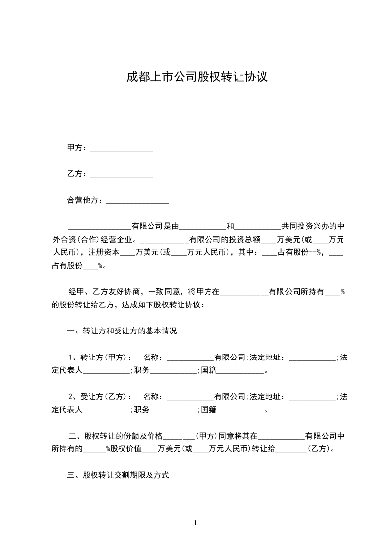 二、股权转让的份额及价格________(甲方)同意将其在____________有限公司中所持有的______%股权价值____万美元(或____万元人民币)转让给________(乙方)。