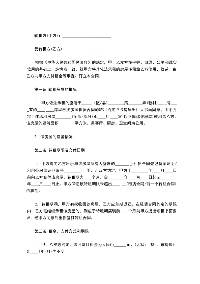 根据《中华人民共和国民法典》的规定,甲、乙双方在平等、自愿、公平和诚实信用的基础上,经协商一致,就甲方将其依法承租的房屋转租给乙方使用、收益、由乙方向甲方支付租金等事宜、订立本合同。