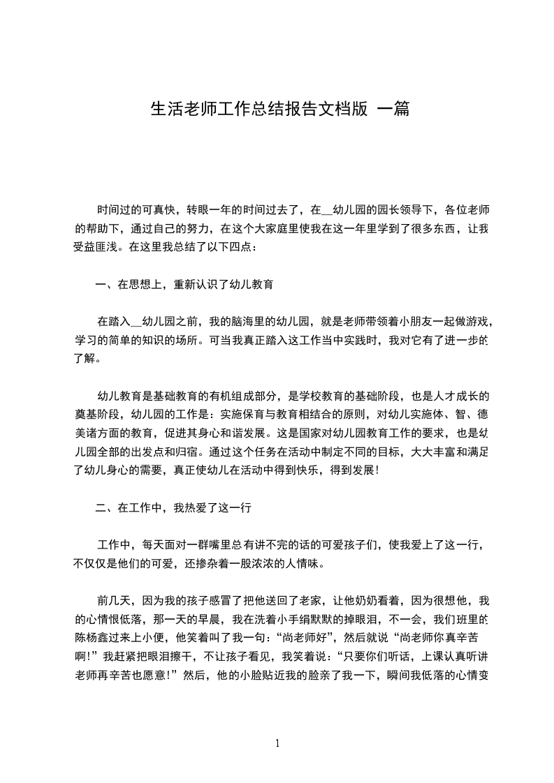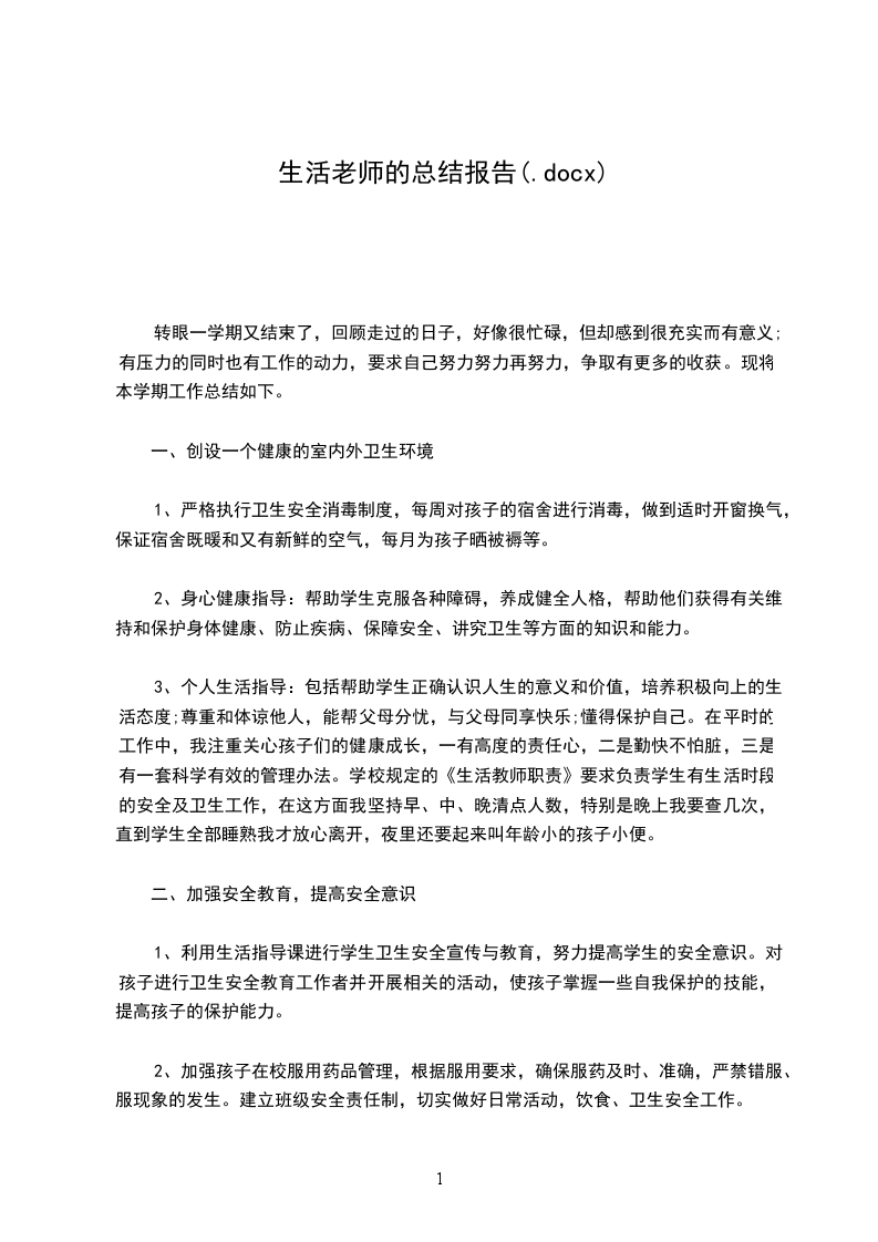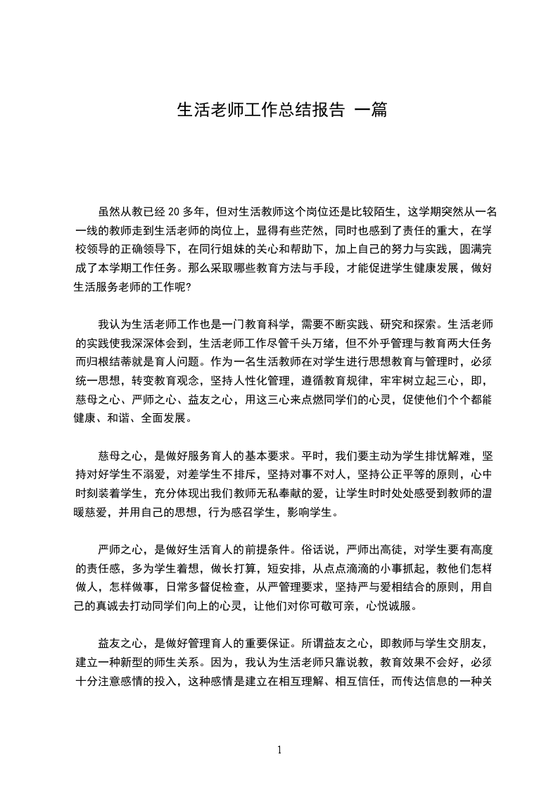 以上是我这一学期的工作和学习情况的总结,虽然完成了任务,但还存在许多不足,我要在以后的工作和学习中,发扬优点、克服不足,不断完善自身,谨言慎行,了解、关爱每一位学生,时时处处做学生的榜样,用自己的善言善行为学生树立榜样,加强自身修养,注意总结经验教训,用一件一件的小事,一点一滴的行动去履行一名生活老师的职责,使工作有所创新,不断进取,把工作做得更好。