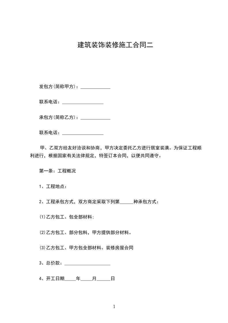 1、双方商定本工程合同承包价格__________ 元(人民币)。