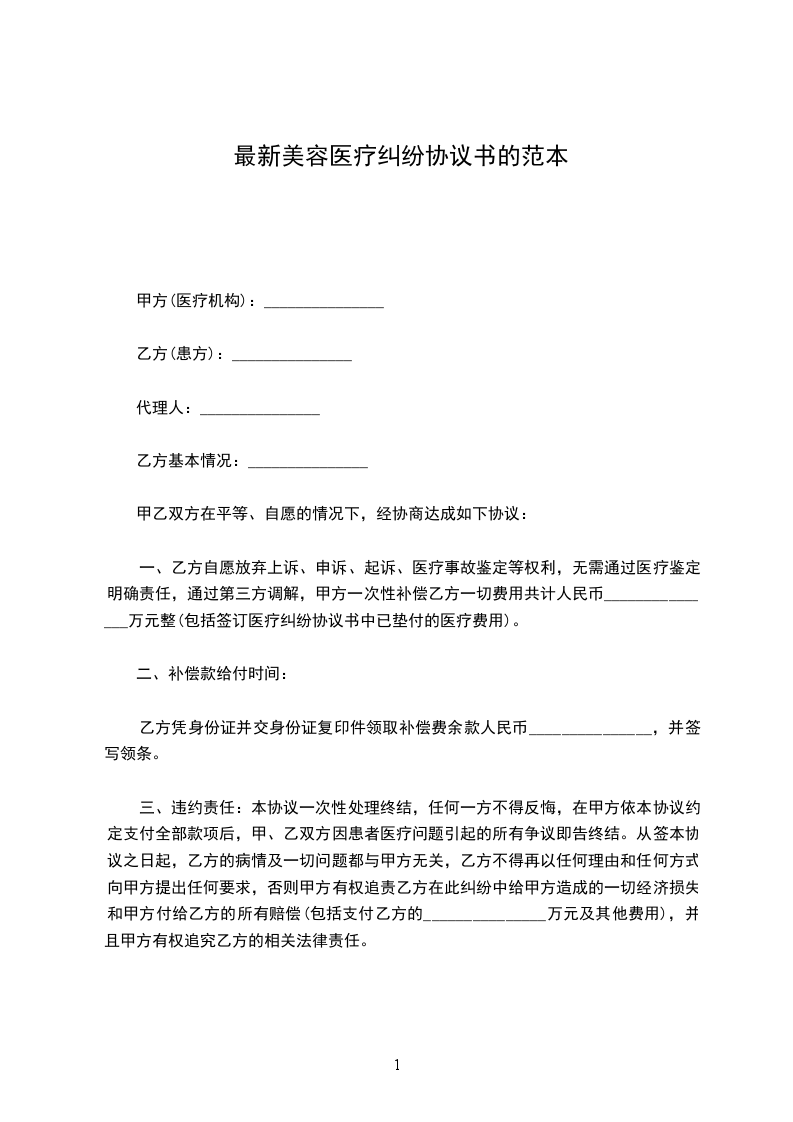 一、乙方自愿放弃上诉、申诉、起诉、医疗事故鉴定等权利,无需通过医疗鉴定明确责任,通过第三方调解,甲方一次性补偿乙方一切费用共计人民币_______________万元整(包括签订医疗纠纷协议书中已垫付的医疗费用)。