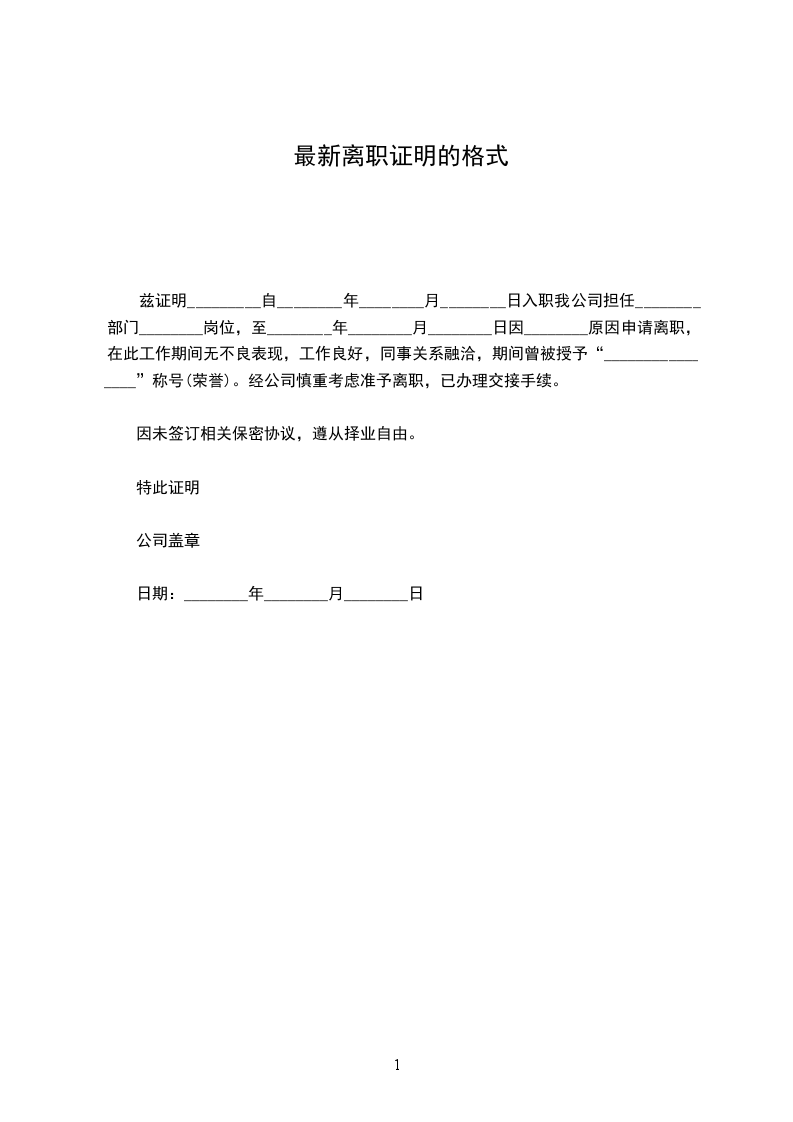 兹证明_________自________年________月________日入职我公司担任________部门________岗位,至________年________月________日因________原因申请离职,在此工作期间无不良表现,工作良好,同事关系融洽,期间曾被授予“________________”称号(荣誉)。经公司慎重考虑准予离职,已办理交接手续。