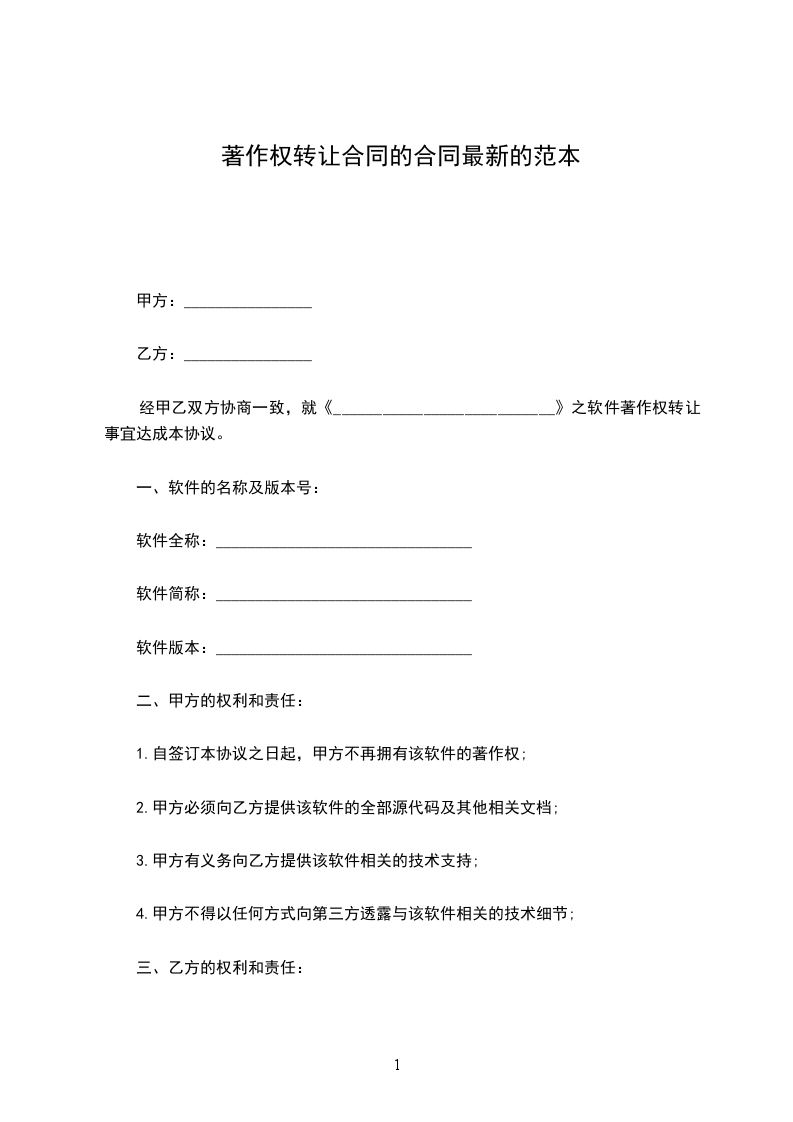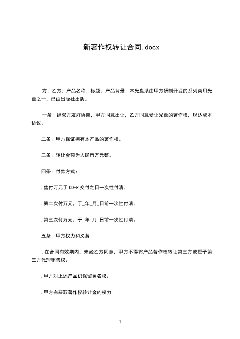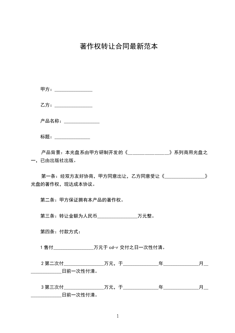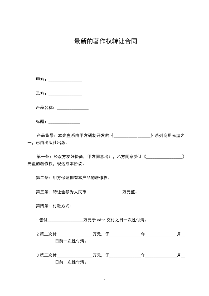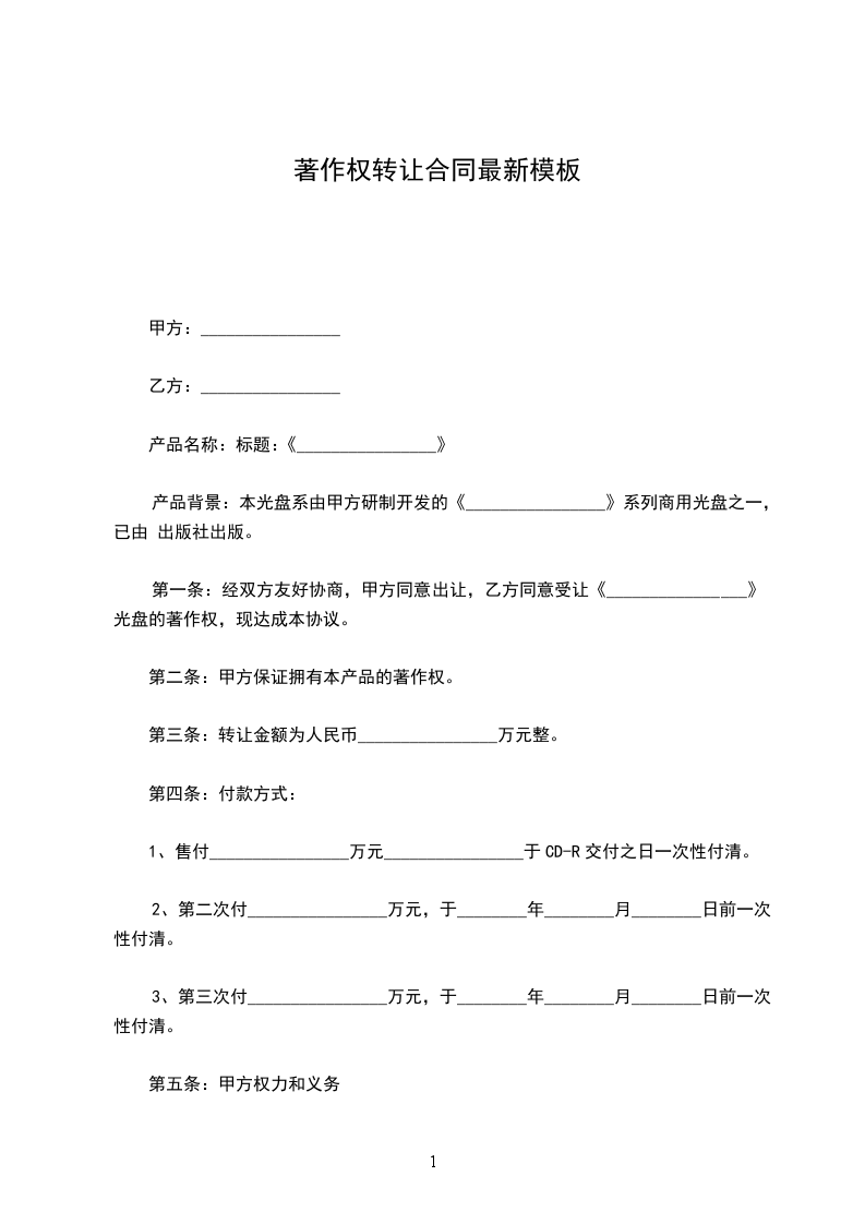 第一条:经双方友好协商,甲方同意出让,乙方同意受让《_________________》光盘的著作权,现达成本协议。