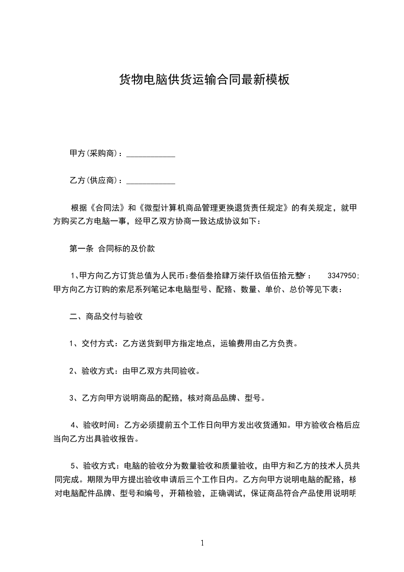1、甲方向乙方订货总值为人民币:叁佰叁拾肆万柒仟玖佰伍拾元整¥:3347950;甲方向乙方订购的索尼系列笔记本电脑型号、配臵、数量、单价、总价等见下表: