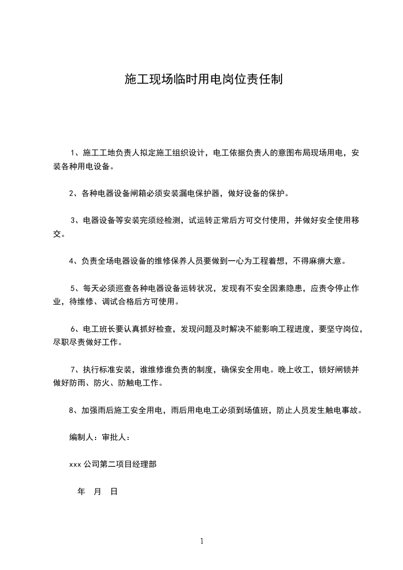 7、执行标准安装,谁维修谁负责的制度,确保安全用电。晚上收工,锁好闸锁并做好防雨、防火、防触电工作。