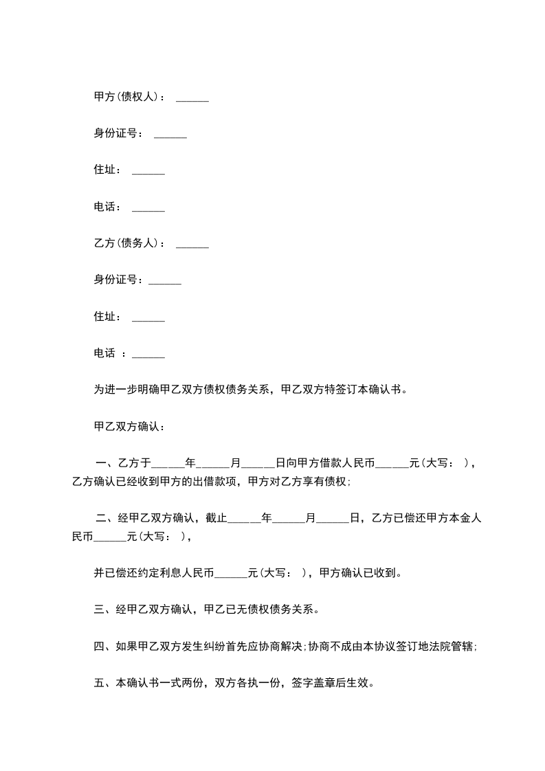 一、乙方于______年______月______日向甲方借款人民币______元(大写: ),乙方确认已经收到甲方的出借款项,甲方对乙方享有债权;