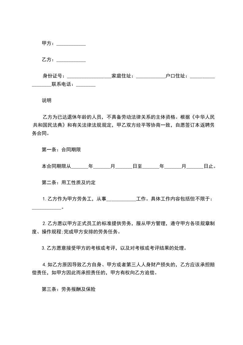 兹有______因________需要,聘用______的退休人员______同志,现经协商一致,特签订本合同,以共同遵守执行。