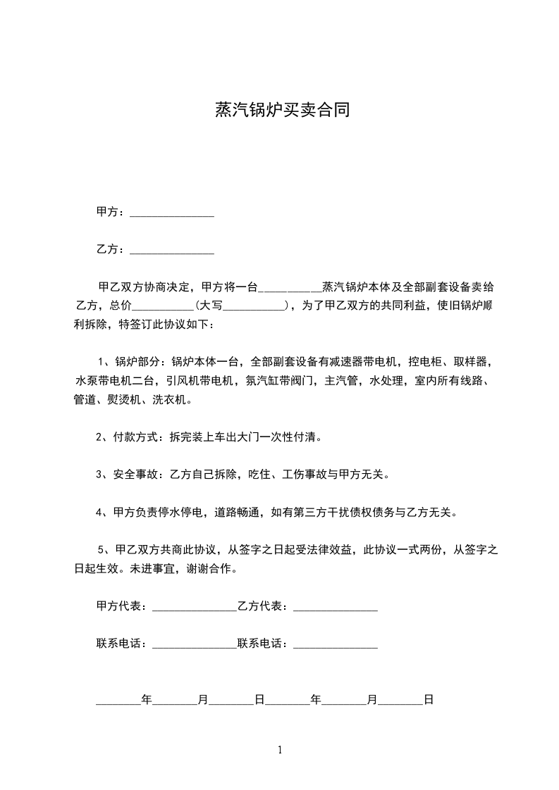 甲乙双方协商决定,甲方将一台___________蒸汽锅炉本体及全部副套设备卖给乙方,总价___________(大写___________),为了甲乙双方的共同利益,使旧锅炉顺利拆除,特签订此协议如下: