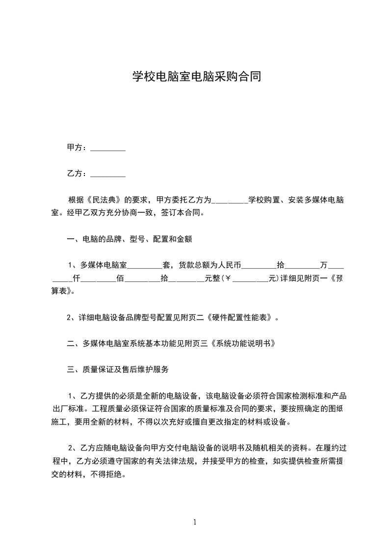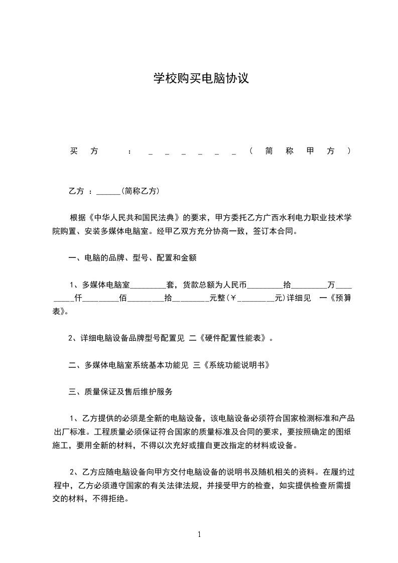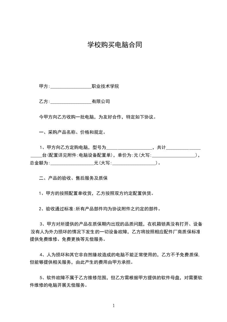 1、甲方向乙方定购电脑,型号为____________________,共计____________________台(配置详见附件:电脑设备配置单),单价为:元(大写:___________________),总金额为:___________________元(大写:___________________)。