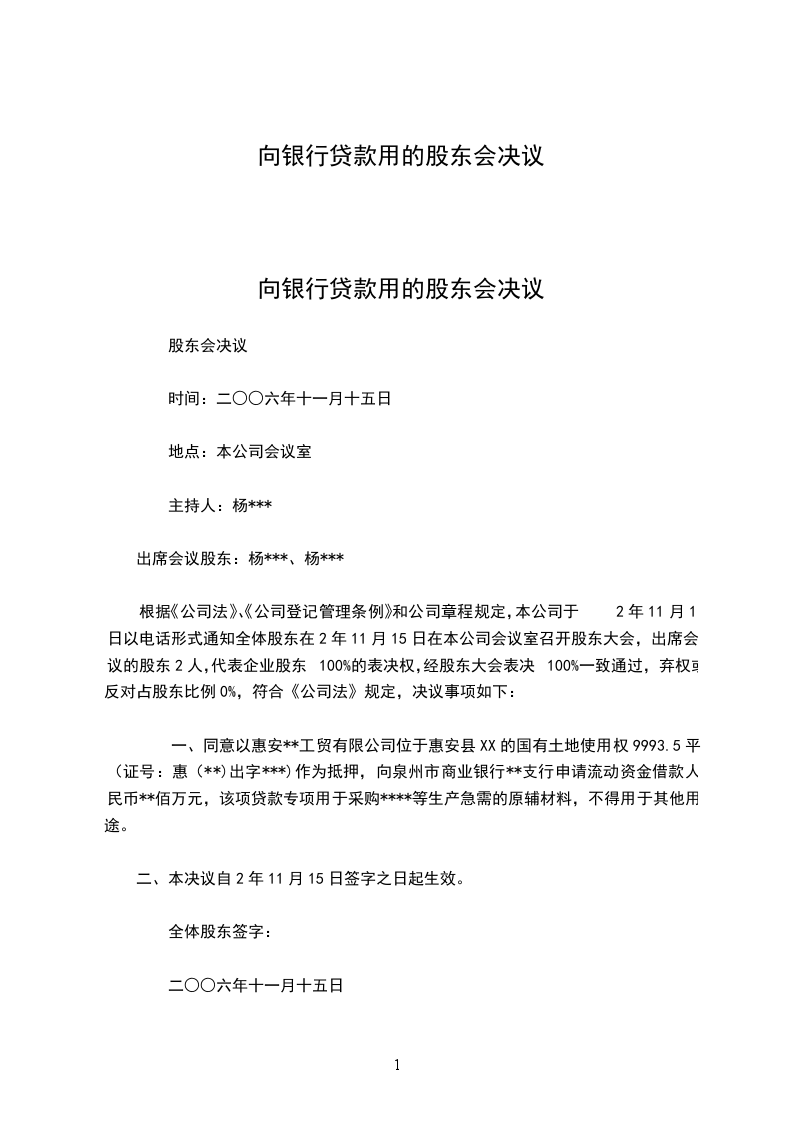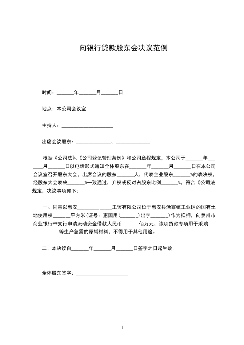 一、同意以惠安______________工贸有限公司位于惠安县涂寨镇工业区的国有土地使用权_______平方米(证号:惠国用(_______)出字_______)作为抵押,向泉州市商业银行**支行申请流动资金借款人民币_______佰万元,该项贷款专项用于采购______________等生产急需的原辅材料,不得用于其他用途。