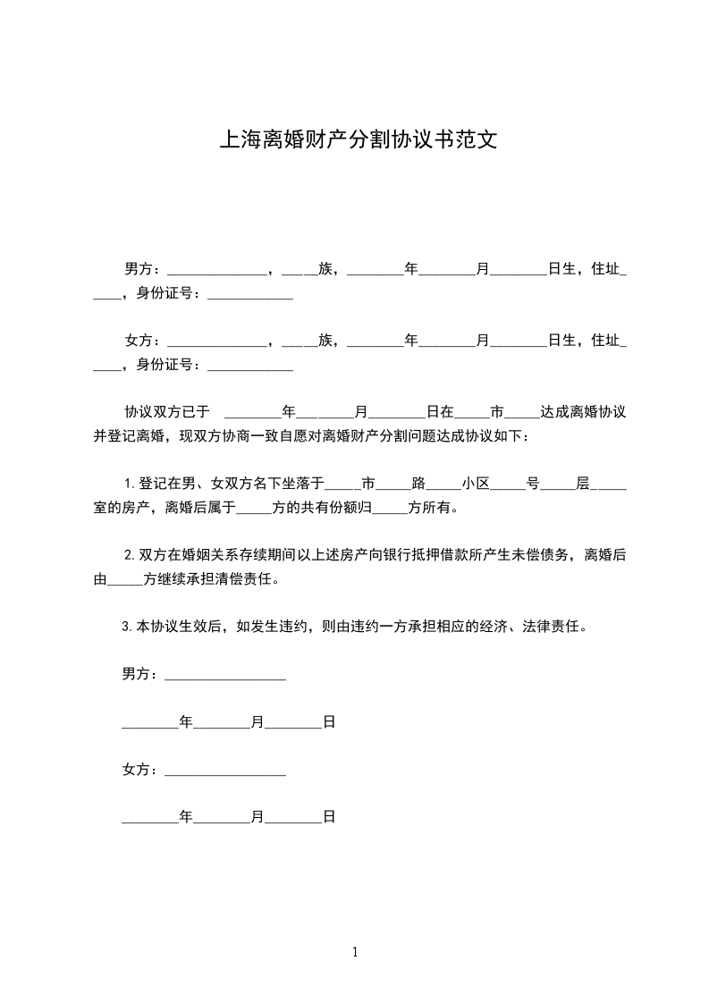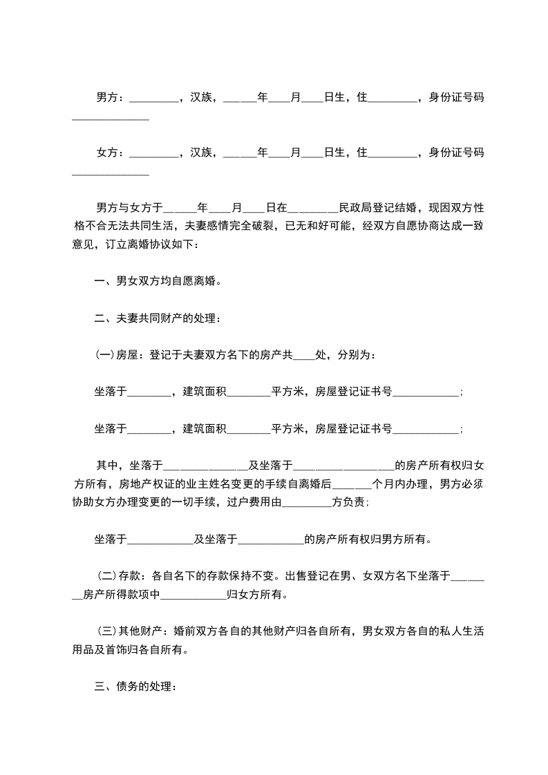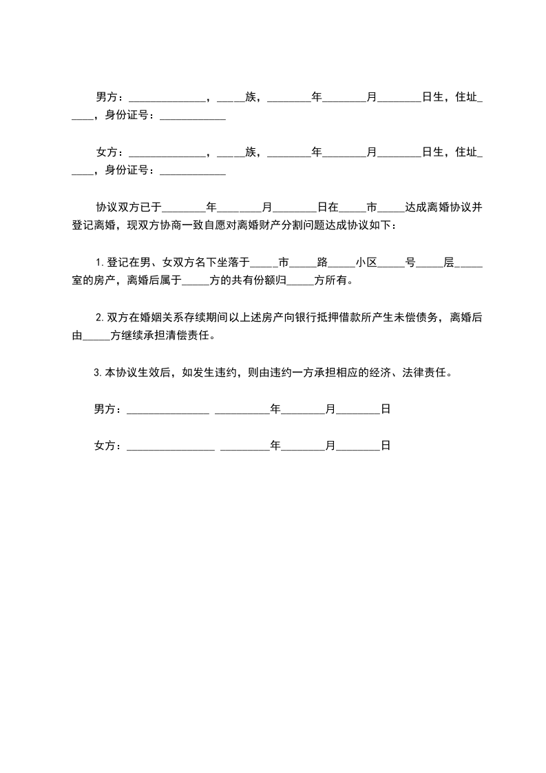 1.登记在男、女双方名下坐落于_____市_____路_____小区_____号_____层_____室的房产,离婚后属于_____方的共有份额归_____方所有。